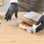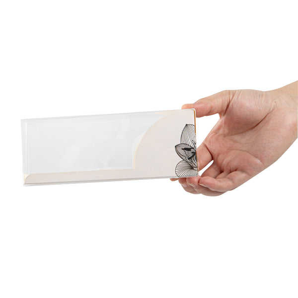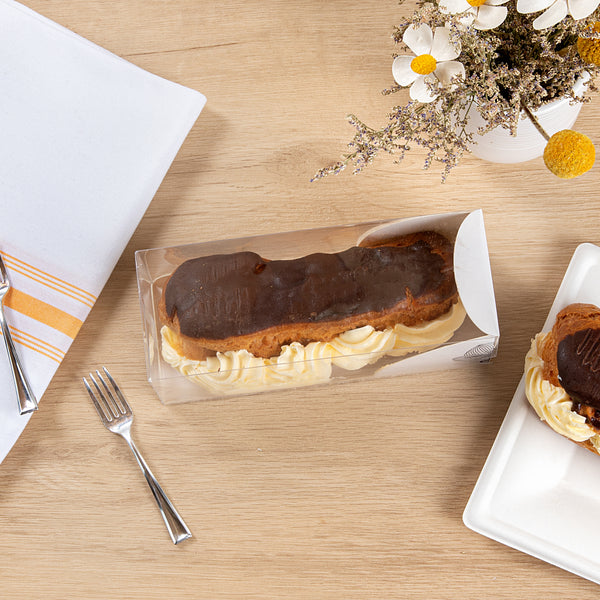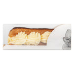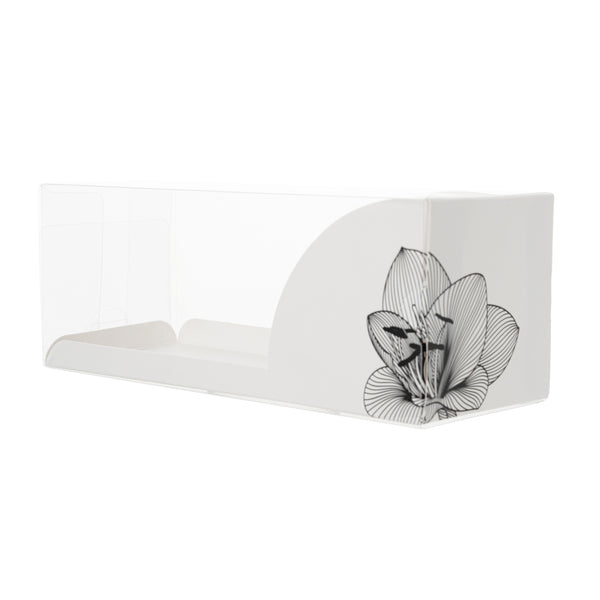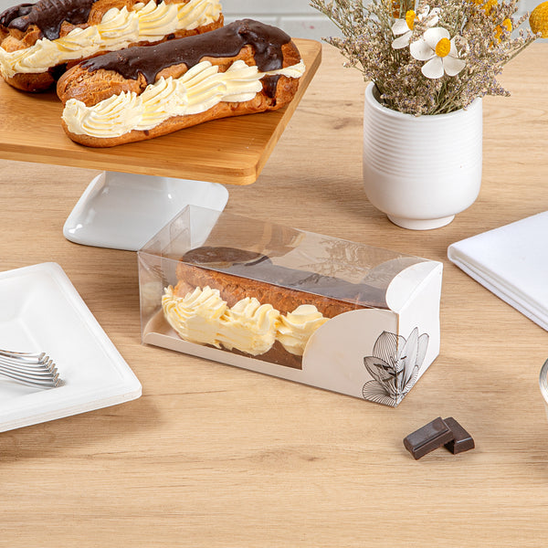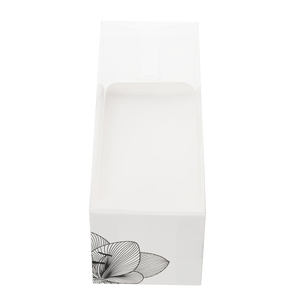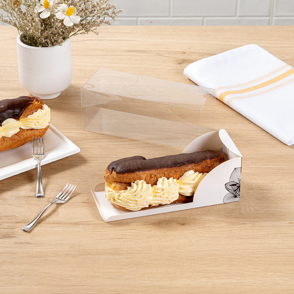 Easily take mini cakes and puff pastries to go using our Sweet Vision White Rectangle Clear Plastic Eclair Boxes. Featuring a stylish white bottom and a printed lotus design, these pastry boxes with windows instantly add a decorative touch to sweets. The paper liner at the bottom of these pastry containers is greaseproof to keep your pastries fresh. With easy-to-open flaps, these clear pastry boxes provide staff members with a quick and efficient way to package dessert orders. These bakery boxes have a see-through top that offers customers a full view of baked goods at your catered event, bakery, or restaurant. Made from premium PET plastic, these disposable bakery boxes are lightweight and crack-resistant to eliminate messes during take out and delivery services. Measuring 7 inches long by 2.5 inches wide, these white bakery boxes are shipped flat and unassembled for space-saving storing in your kitchen. Sold in a 100 count box.