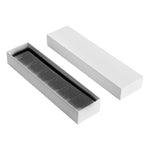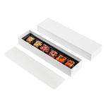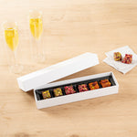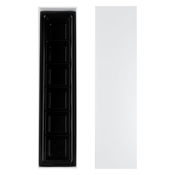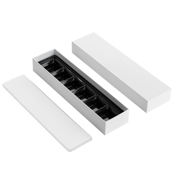 Satisfy your guests' sweet tooth with our Sweet Vision Rectangle White Paper Candy / Chocolate Boxes. These candy boxes are constructed with heavy-duty paper, ensuring they are strong and durable enough to hold all your delicious treats. The 6-compartment tray of these paper chocolate boxes is designed to hold one chocolate in each cavity. These paper candy boxes with a clear lid allow your guests to see all the delightful treats, while securely protecting them. Open and close these assorted chocolate boxes effortlessly with their slide-open plastic sleeves. This greaseproof chocolate packaging is disposable for effortless disposal. With a white finish, these rectangular gift packaging boxes add a touch of simplicity to your sweets. Measuring 10.75 inches long by 2.75 inches wide by 1.5 inches tall, these candy gift boxes are ideal for holding chocolates, cookies, or cakes. Shipped unassembled in a 10 count box.