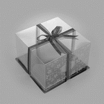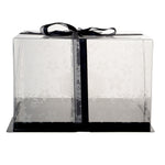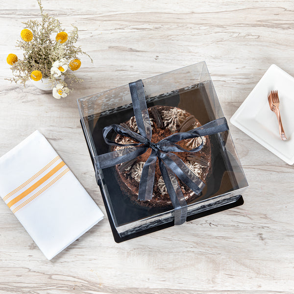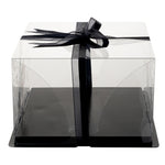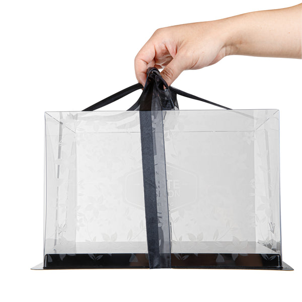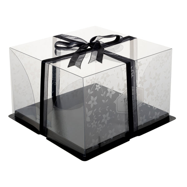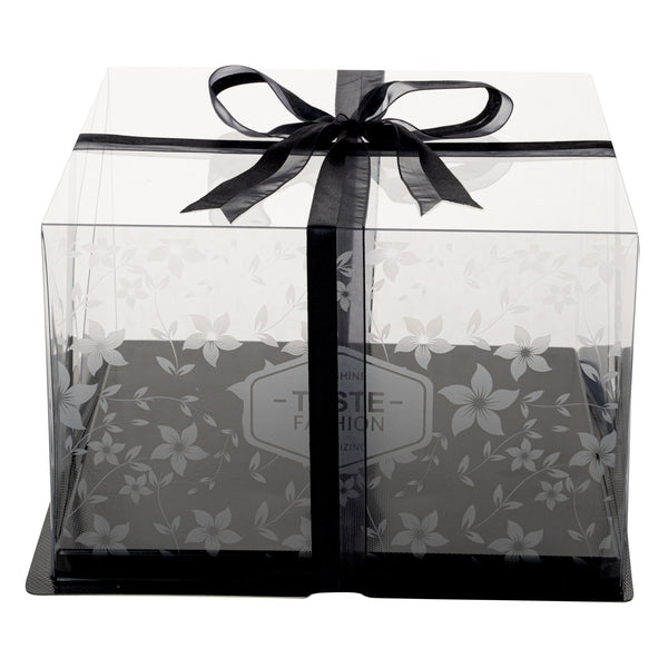 PLASTIC CAKE BOX - BLACK BASE, BLACK RIBBON, FLOWER GARDEN DESIGN