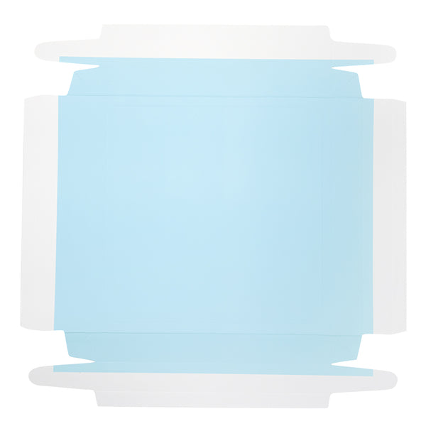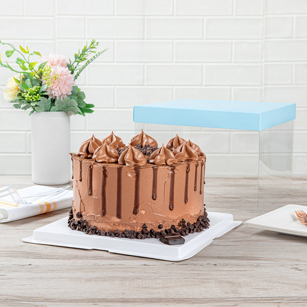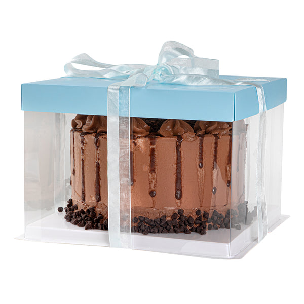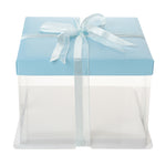 SQUARE CLEAR PLASTIC CAKE BOX - BLUE LID AND WHITE BASE, BLUE RIBBON