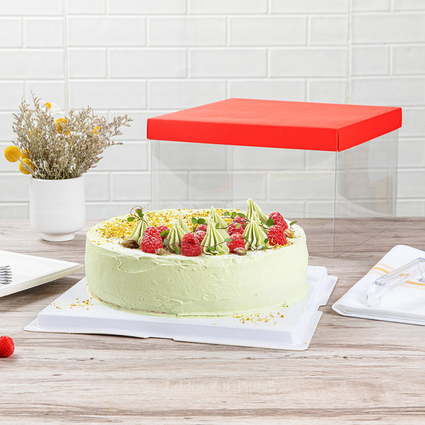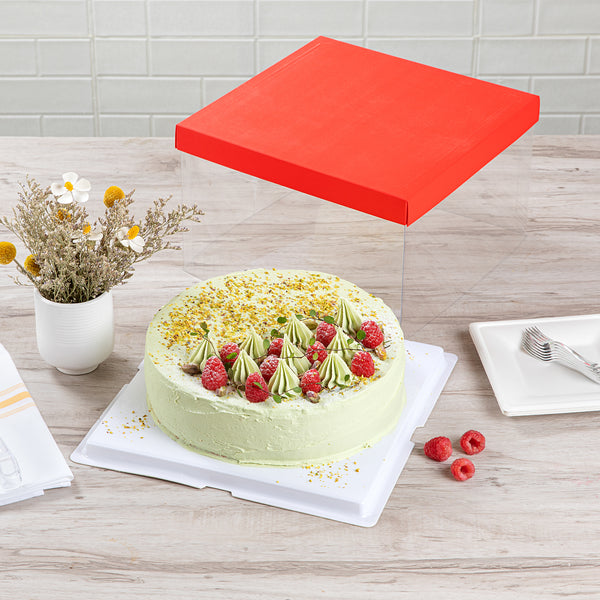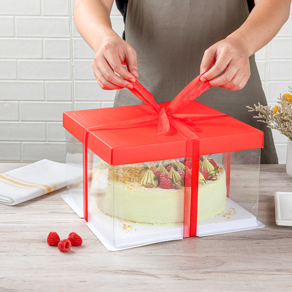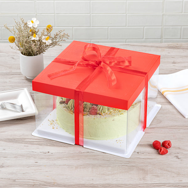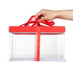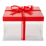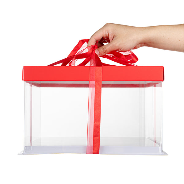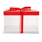 SQUARE CLEAR PLASTIC CAKE BOX - RED LID AND WHITE BASE, RED RIBBON