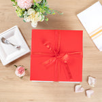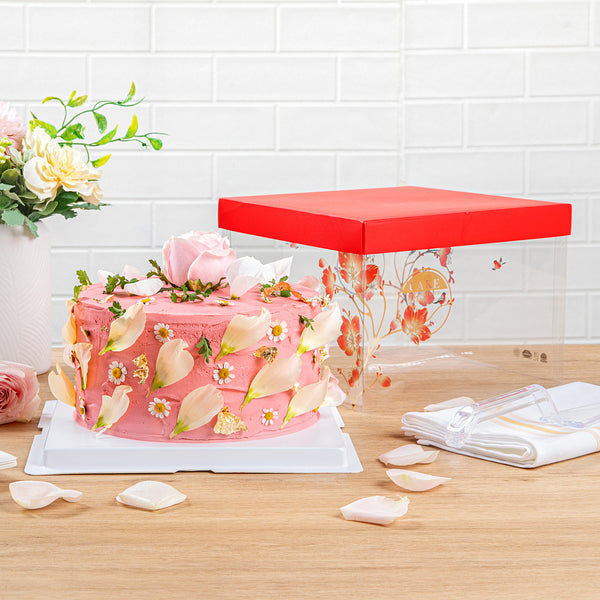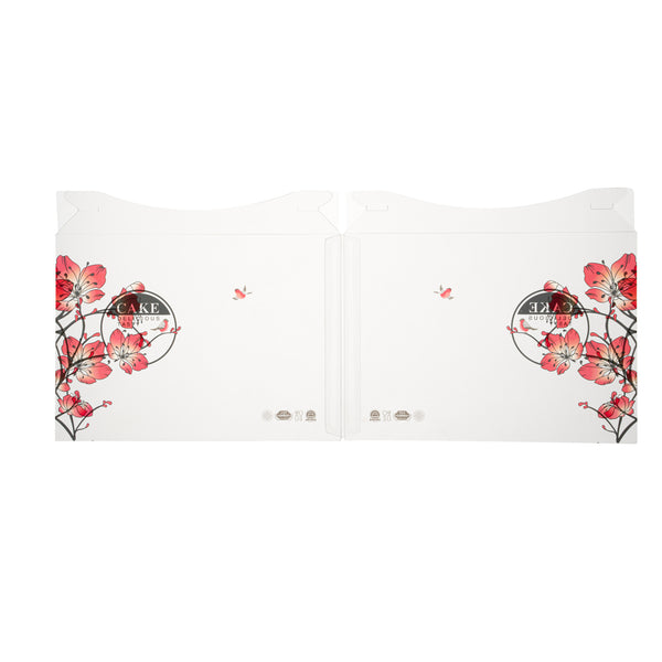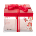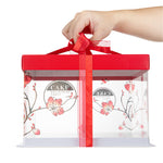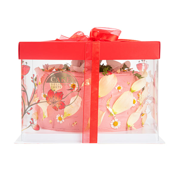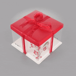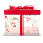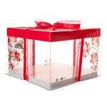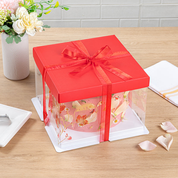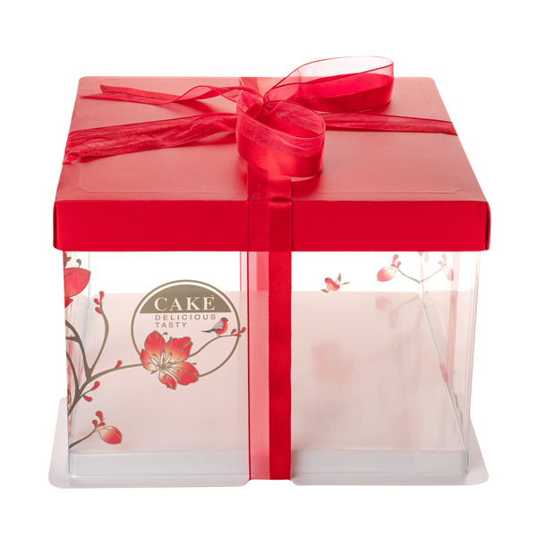 PLASTIC CAKE BOX - RED LID / RIBBON, WHITE BASE, FLOWER / BIRD ACCENT