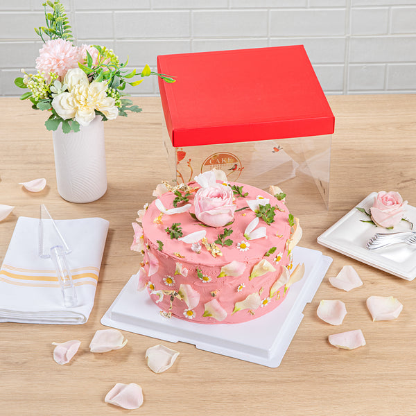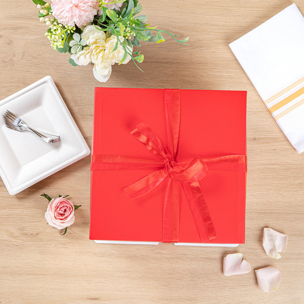 Every order includes 10 bases, 10 lids, 10 plastic containers, and ribbon, providing you with all the essentials to easily build your cake boxes. Conveniently package all types of baked goods for special occasions.