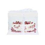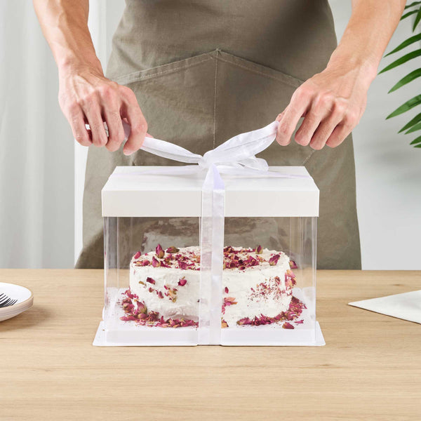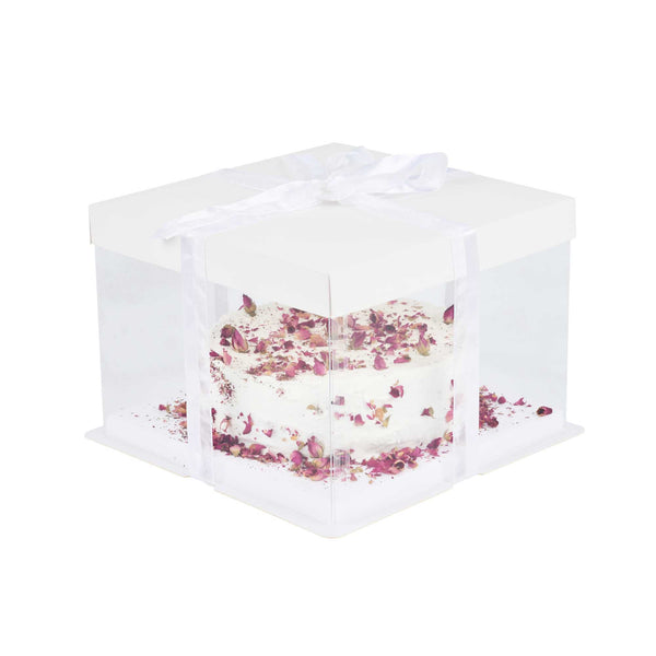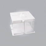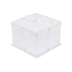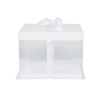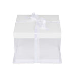 SQUARE CLEAR PLASTIC CAKE BOX - WHITE LID AND WHITE BASE, GRAY RIBBON