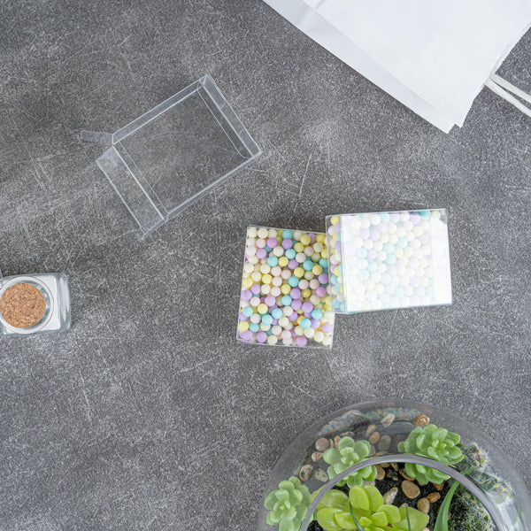 Our candy boxes are crystal clear so your guests can easily see their sweets or party favors in each box. Show off your colorful candies or delicious baked goods!