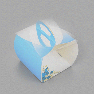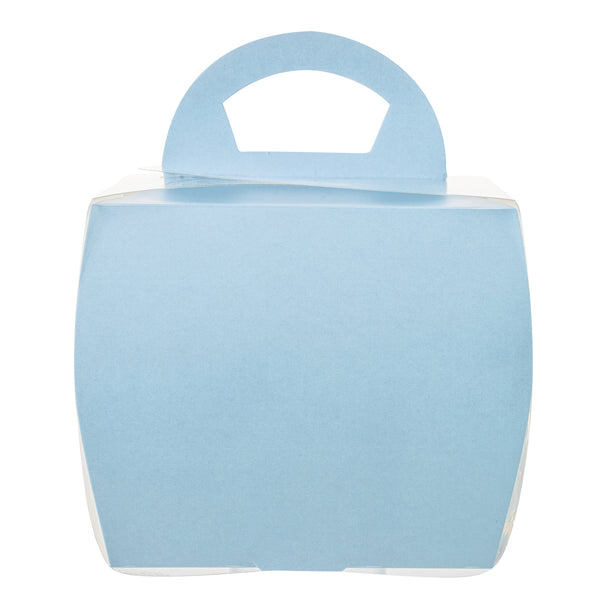 PLASTIC CUPCAKE BOX - WITH HANDLE, BLUE PAPER WRAP, FLOWER ACCENT