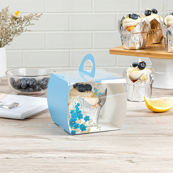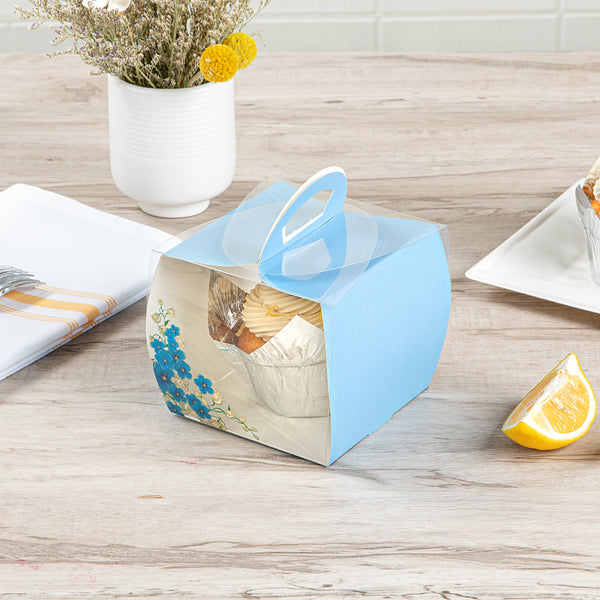 Perfectly package your special desserts with these Sweet Vision Square Clear Plastic Cupcakes Boxes. These clear pastry boxes feature images of gorgeous flowers which complement your cupcakes, muffins, and tarts. The built-in handle of these muffin boxes provides a comfortable and secure hold while transporting your delicious treats. These muffin boxes have a grease-resistant base to prevent unsightly greasy stains, making these ideal for filling up with perfectly frosted cupcakes. Equipped with a beautiful blue paper wrap, these elegant cupcake containers effortlessly blend with the setting of any bakery, catered event, or restaurant. These disposable blue cupcake boxes easily package baked goods for your carryout and delivery orders. Shipped flat to save space, these cupcake bakery boxes can be quickly assembled to shorten your packaging process. These small dessert boxes measure 4 inches in length by 4 inches in width by 4.25 inches in height. Sold in a 100 count box.