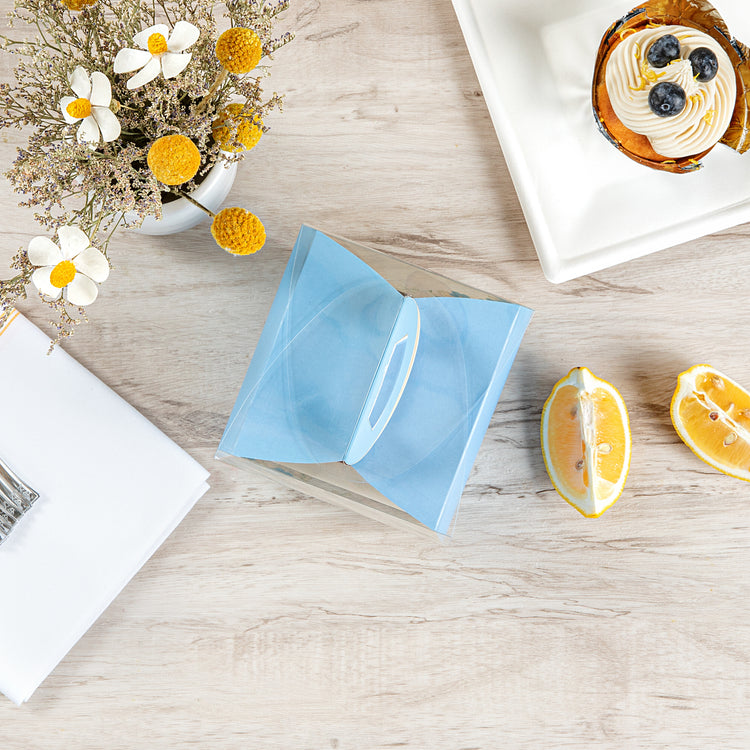 Perfectly package your special desserts with these Sweet Vision Square Clear Plastic Cupcakes Boxes. These clear pastry boxes feature images of gorgeous flowers which complement your cupcakes, muffins, and tarts. The built-in handle of these muffin boxes provides a comfortable and secure hold while transporting your delicious treats. These muffin boxes have a grease-resistant base to prevent unsightly greasy stains, making these ideal for filling up with perfectly frosted cupcakes. Equipped with a beautiful blue paper wrap, these elegant cupcake containers effortlessly blend with the setting of any bakery, catered event, or restaurant. These disposable blue cupcake boxes easily package baked goods for your carryout and delivery orders. Shipped flat to save space, these cupcake bakery boxes can be quickly assembled to shorten your packaging process. These small dessert boxes measure 4 inches in length by 4 inches in width by 4.25 inches in height. Sold in a 100 count box.