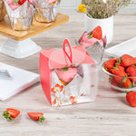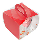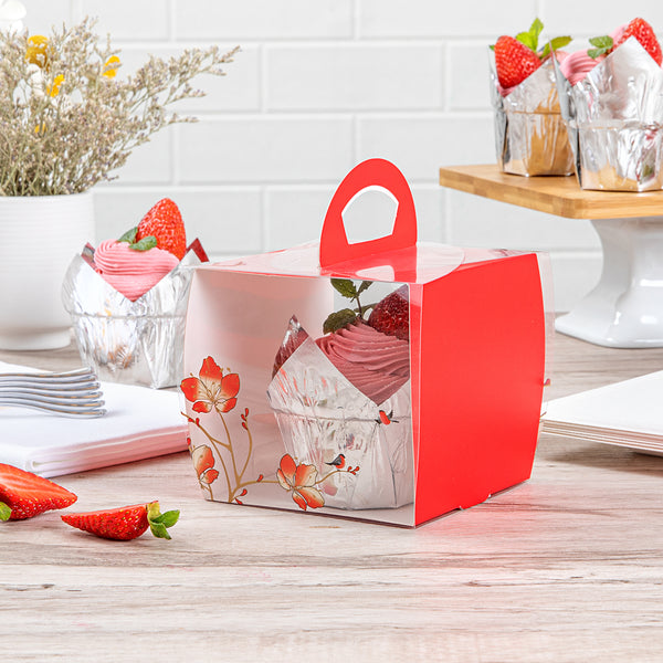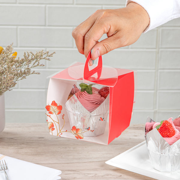 PLASTIC CUPCAKE BOX - WITH HANDLE, RED PAPER WRAP, FLOWER / BIRD
