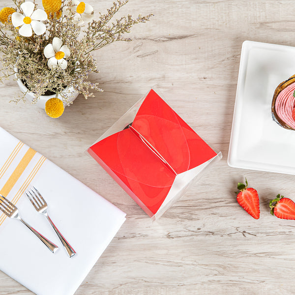 Beautifully dress your fare in these Sweet Vision Square Clear Plastic Cupcake Boxes. These clear cupcake containers have charming images of birds and flowers which draw customers to its high-quality design. With a built-in handle, these cupcake packaging boxes allow employees to carry boxes with only one hand, making it easier to transport multiple delivery orders. Perfect for packaging glazed pastries, these cupcake treat boxes are non-stick so you can easily remove your treats without smudging the frosting. The elegant red paper wrap of these cupcake carrier boxes securely keeps your cupcakes, muffins, and tarts from falling out in case of any accidents. These disposable red cupcake boxes make cleaning up at the end of the day a hassle-free process. These muffin gift boxes are shipped flat for space-saving storage and can be quickly assembled at your catering service, bakery, diner, or other foodservice establishments. Measuring 4 inches in length by 4 inches in width by 4.25 inches in height, these cupcake bakery boxes are sold in a 100 count box.