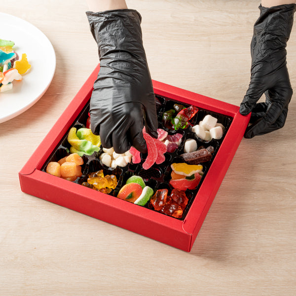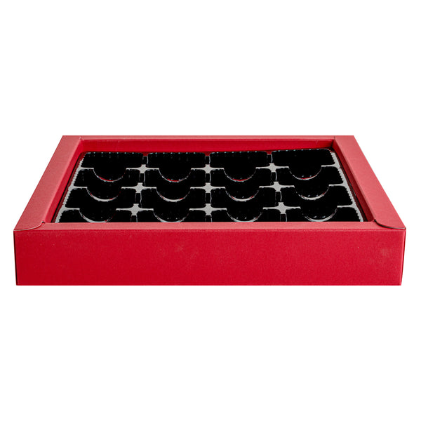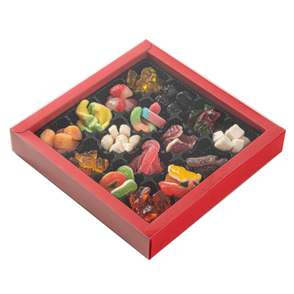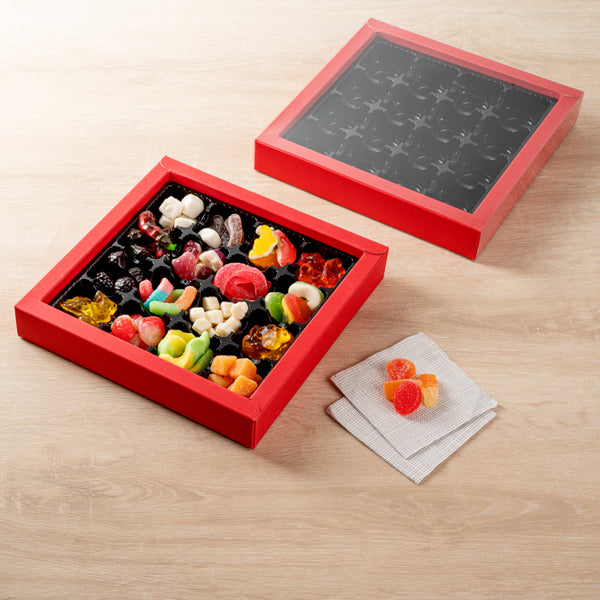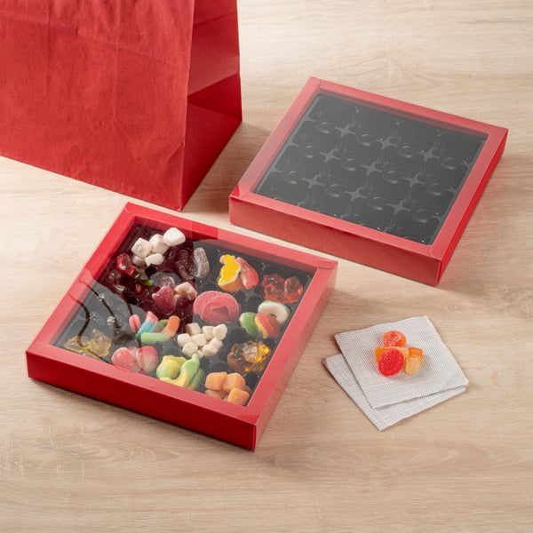 Package your candies and baked goods with our Sweet Vision Square Red Paper Candy / Chocolate Boxes. These paper candy boxes are made using heavy-duty paper, allowing them to be durable and sturdy. With 16 compartments, the tray of these paper chocolate boxes perfectly holds one chocolate per compartment. These greaseproof gift packaging boxes are disposable, enabling you to discard them after use. The clear plastic sleeves of these candy gift boxes secure all the content inside. With a slide-open mechanism, these assorted chocolate boxes allow you to easily access what's inside. The red finish of these square chocolate boxes exudes a charming effect on your guests. Measuring 9 inches long by 9 inches wide by 1.5 inches tall, these gift packaging boxes are ideal for holding chocolates, cookies, or cakes. Shipped unassembled in a 10 count box.