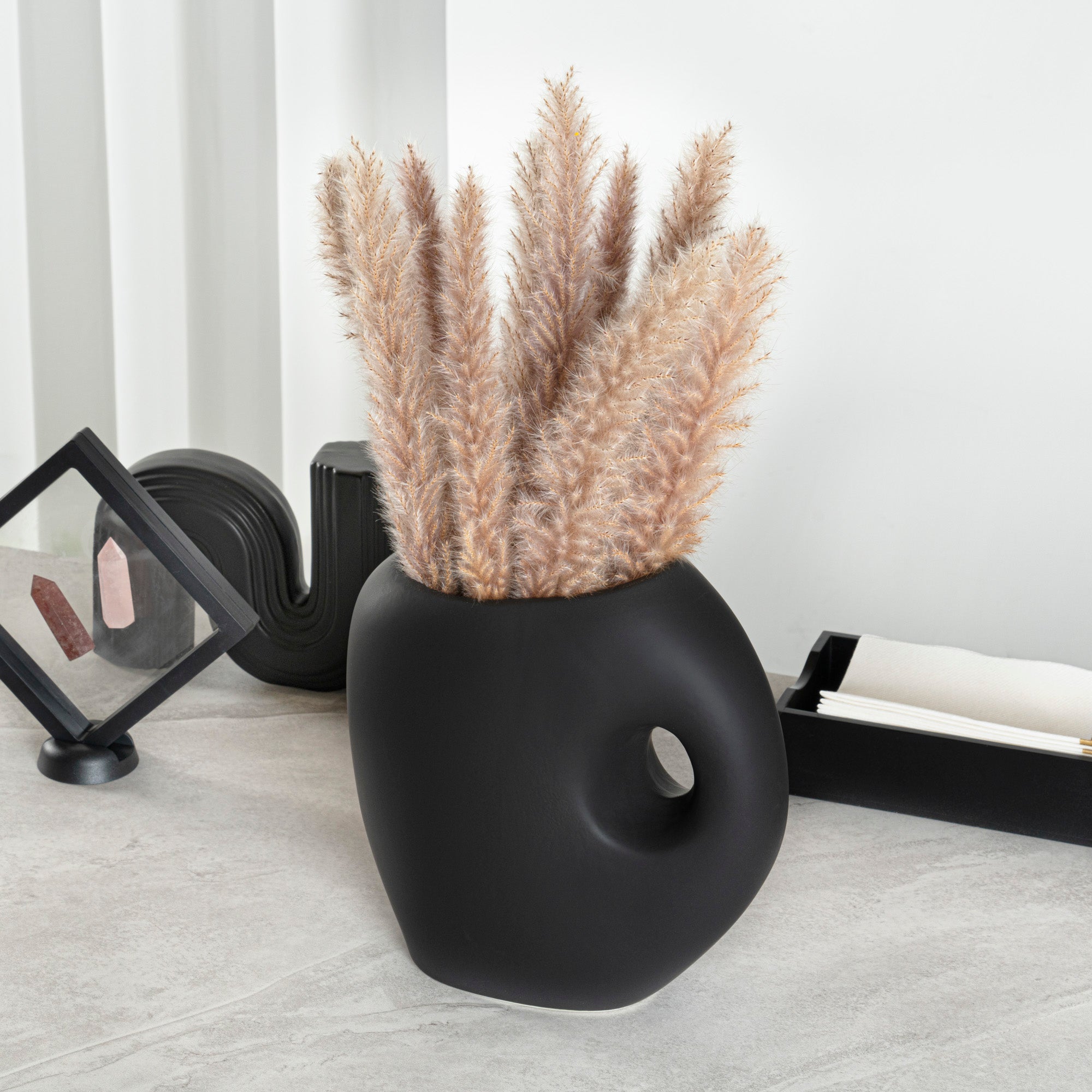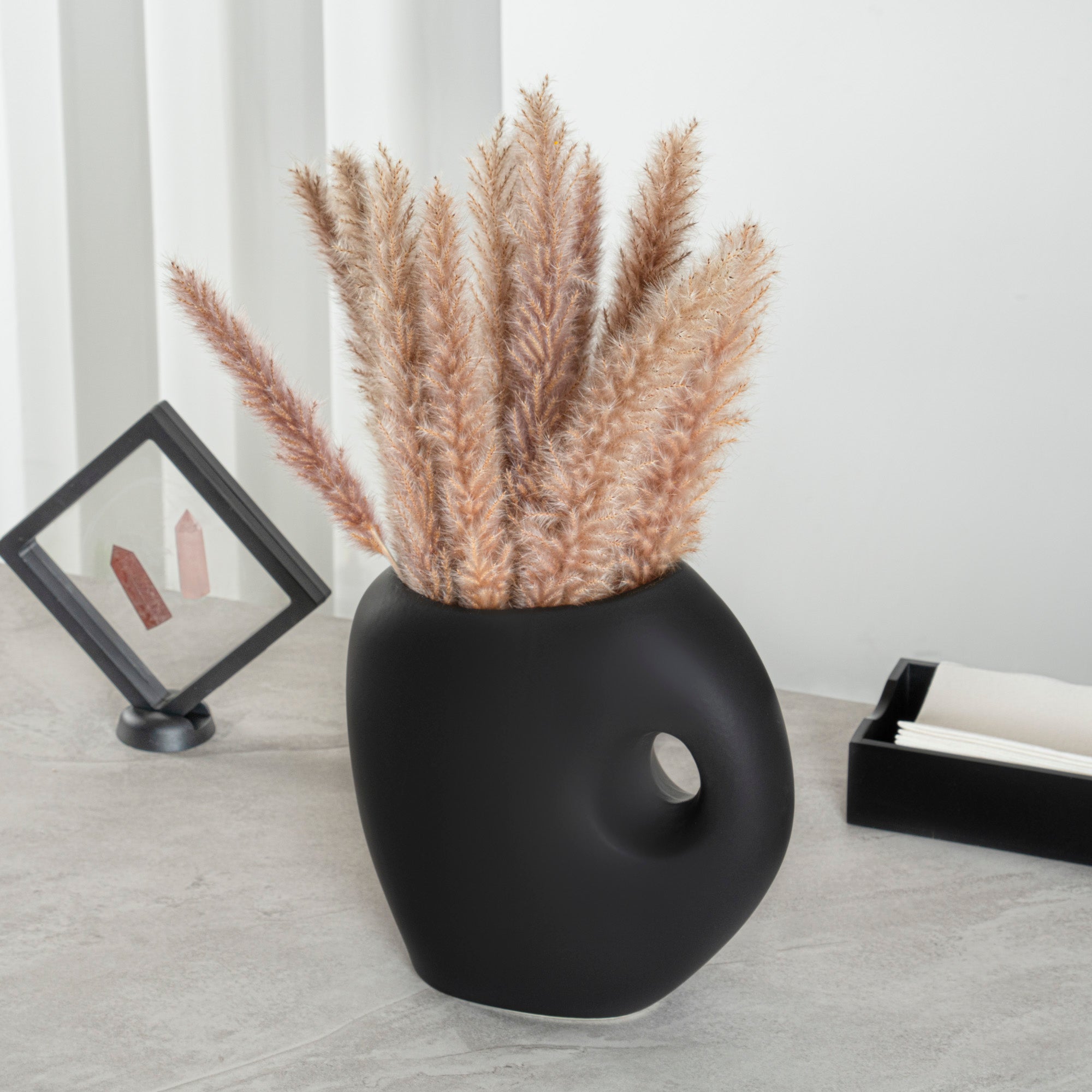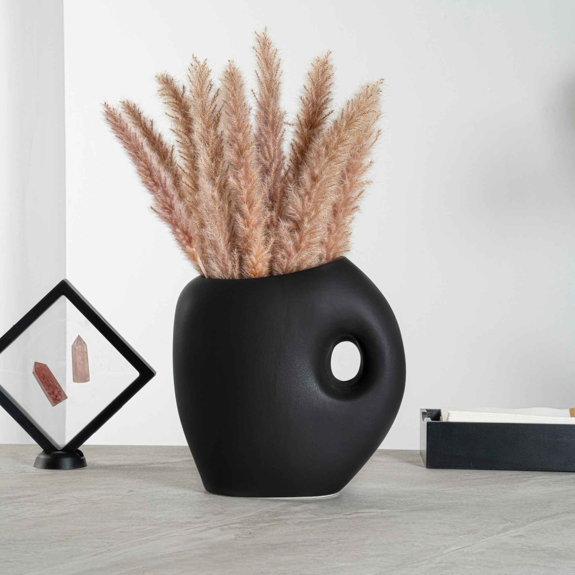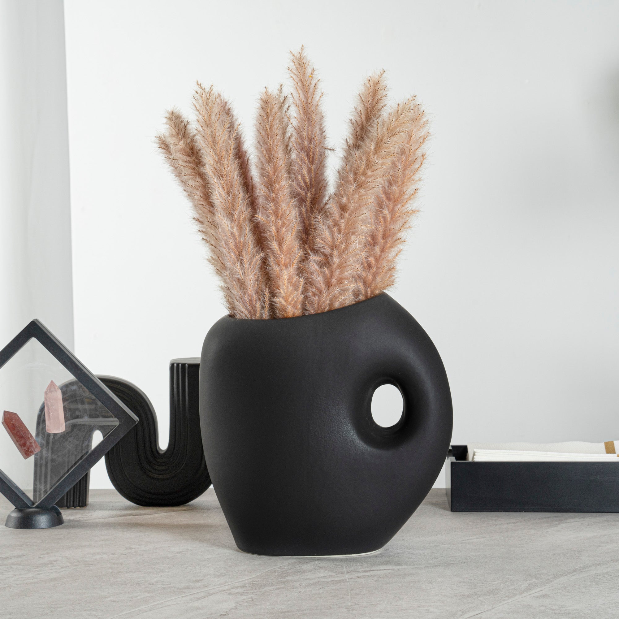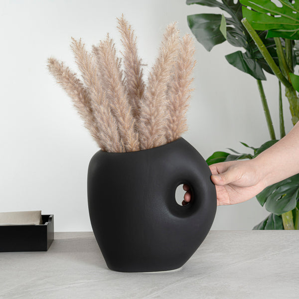 Introduce elegance to any space with our Table Art Black Ceramic Jug Vase. Designed in the classic jug style, this ceramic vase provides a charming option for showcasing floral arrangements. The carefully crafted opening of this decorative vase makes arranging various flowers effortless. Featuring a convenient built-in handle, the jug vase ensures easy handling and transport. The sleek black finish of this flower vase enhances its sophisticated appeal, adding refinement to any floral display or decor setting. Made from premium ceramic, this centerpiece vase ensures durability and sturdiness, providing years of timeless beauty. With its stable base, this black ceramic vase minimizes the risk of tipping over. Suitable for various environments, this table vase complements modern living rooms with stylish office spaces. This black vase is versatile and can be used as a standalone centerpiece or for displaying floral arrangements. To provide easy upkeep, this black decorative vase can be hand washed to maintain its pristine appearance. Measuring 9 inches in length by 4.5 inches in width by 9.5 inches in height, this black flower vase fits perfectly in various settings. Sold in a 1 count box.