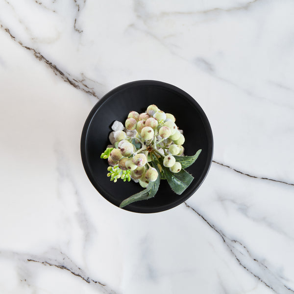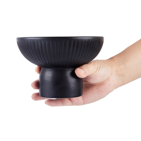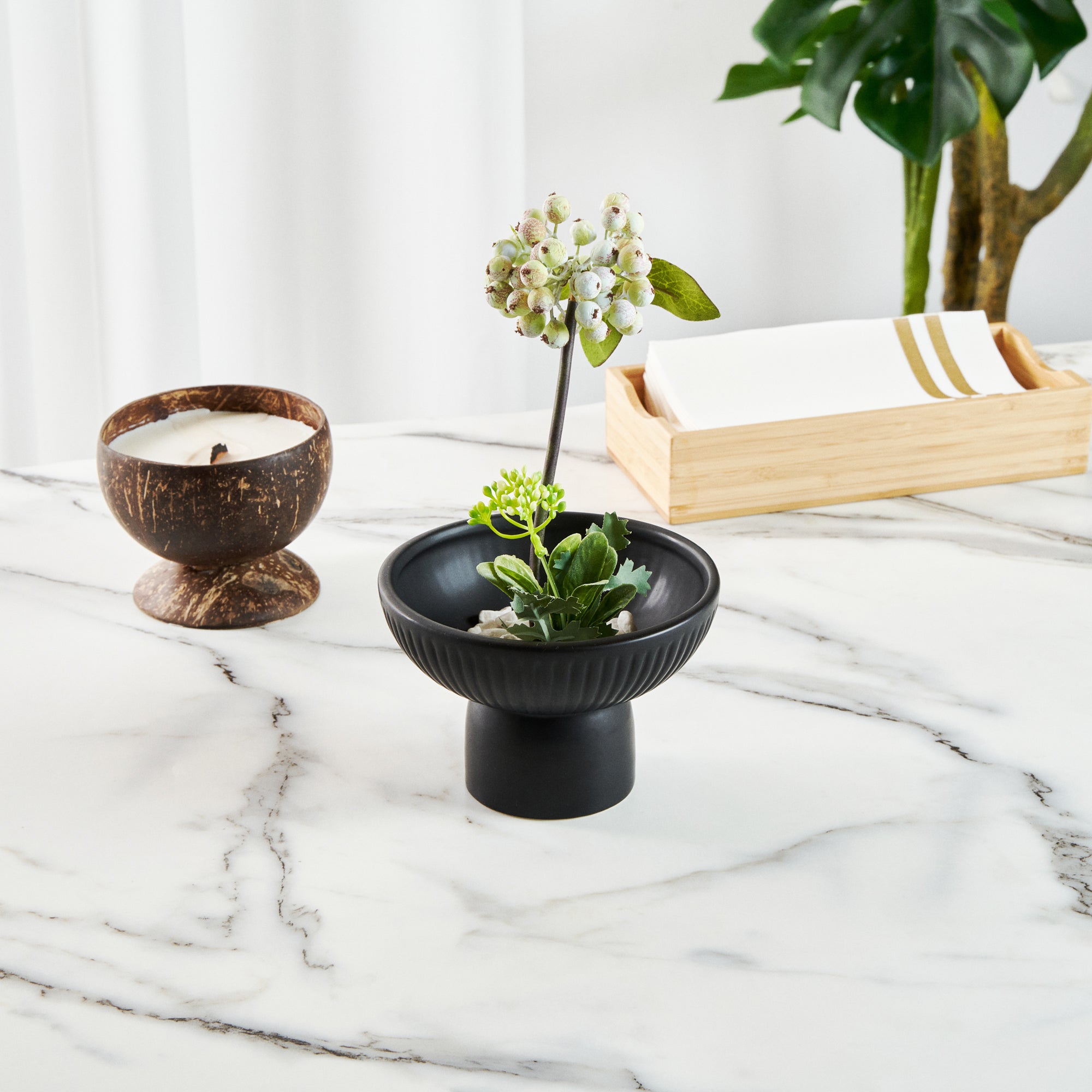 Elevate your decor with our Table Art Black Ceramic Pedestal Vase. The sophisticated pedestal-style design of this ceramic vase creates visual intrigue and elevates your space, making it a striking centerpiece that blends elegance and modernity. With an elevated base, this decorative vase minimizes the risk of tipping to keep your floral arrangements intact. The black finish of this flower vase exudes a sense of modern sophistication and enhances the beauty of any floral arrangement or standalone display. This centerpiece vase is manufactured from premium ceramic for long-lasting durability and sturdiness. Suitable for various settings, this table vase complements traditional and modern decor styles. This black vase is versatile and can be used as a standalone centerpiece or vessel for showcasing your favorite blooms. To maintain its pristine appearance, this black ceramic vase can be hand washed with soap and water for easy upkeep. This black decorative vase measures 6 inches in diameter by 4.1 inches in height. Sold in a 1 count box.
