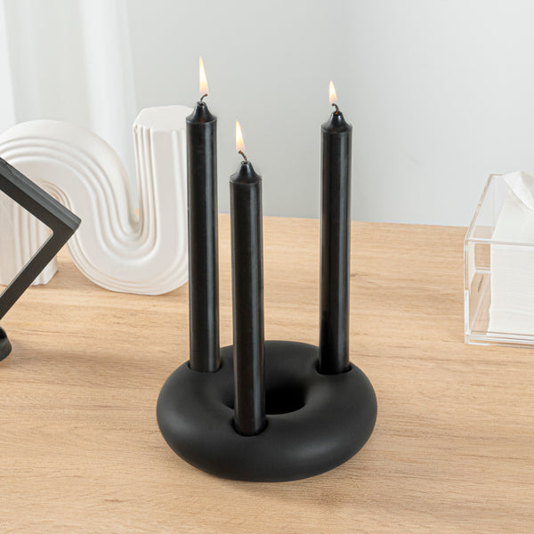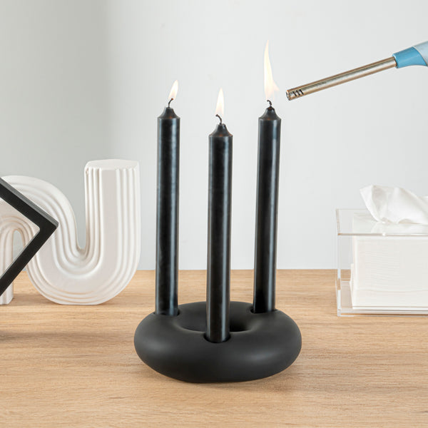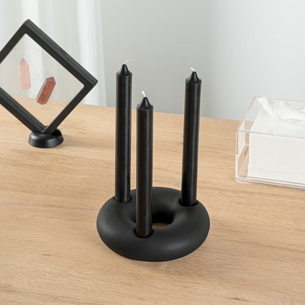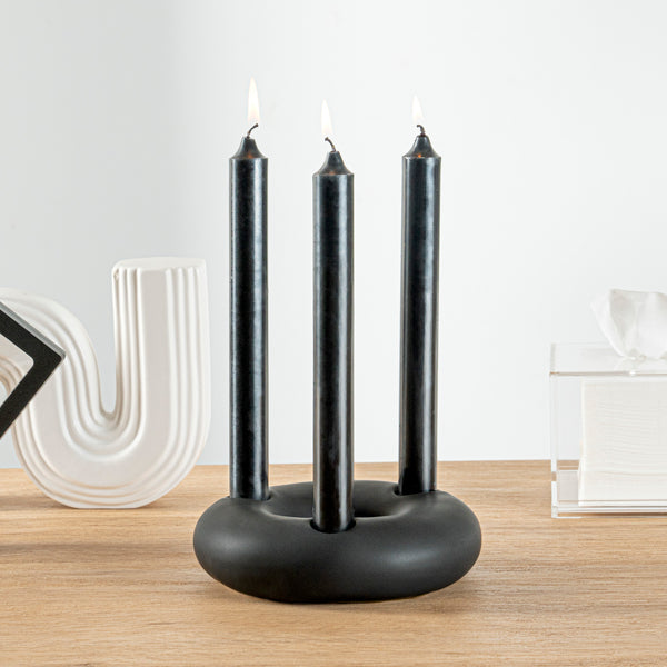Amplify your decor style with our Table Art Black Ceramic Ring Vase. This ceramic vase boasts an exquisite design with graceful contours that create a striking visual appeal and enhance the elegance of any space. The sleek black finish of this candle holder adds a touch of modern sophistication, making it a stylish piece that enhances any decor. Manufactured from premium ceramic, this decorative vase boasts durability and sturdiness for long-lasting use at your home or office. This table vase effortlessly complements a wide variety of traditional and contemporary decor styles. The versatile design of this black vase allows you to use it as a standalone structural accent. This black ceramic vase can be hand washed with soap and water, facilitating easy upkeep to maintain its pristine appearance. Measuring 6 inches in diameter by 1.75 inches in height, this stylish black vase creates a stunning visual focal point in your space. Sold in a 1 count box.