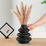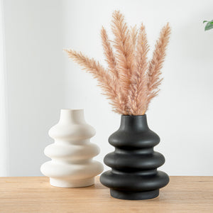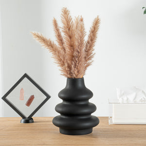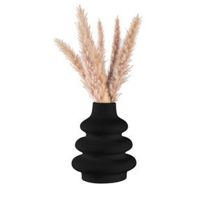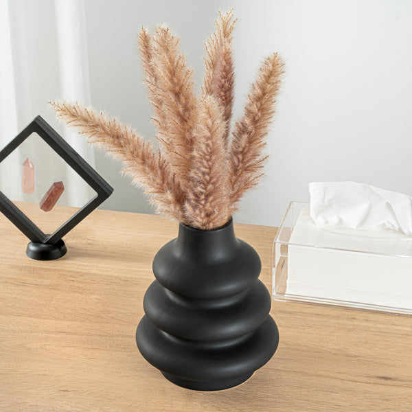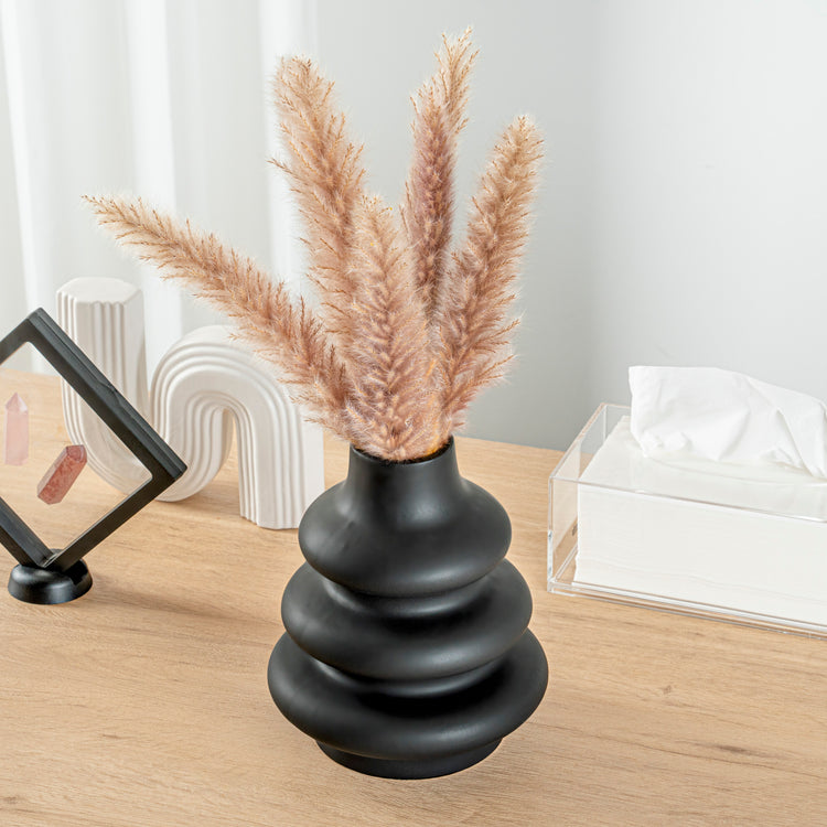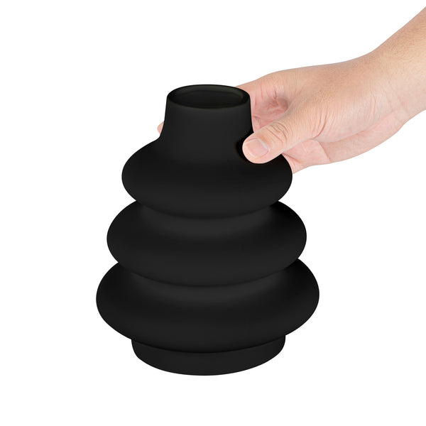 Elevate your living room space with our Table Art Black Ceramic Stacked Vase. This ceramic vase features an exquisite design with soft contours, enhancing its aesthetic appeal and adding a sense of graceful elegance to any space. The sleek black finish of this flower vase exudes modern sophistication, making it a chic addition to any decor. Made from premium ceramic, this decorative vase is durable and sturdy, ensuring long-lasting use for years to come. With a stable base, this centerpiece vase minimizes the risk of tipping over and ensures your floral arrangements remain intact. This table vase complements various traditional and contemporary decor styles, making it an ideal choice for any home or office setting. The versatile design of this black vase serves as an elegant centerpiece or a stylish vessel for floral arrangements, enhancing the ambiance of any room. This black ceramic vase can be hand washed and facilitates easy upkeep for its pristine appearance. Measuring 6.75 inches in length by 6.75 inches in width by 8 inches in height, this black decorative vase is perfect for various floral arrangements. Sold in a 1 count box.