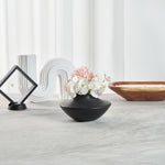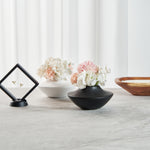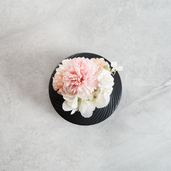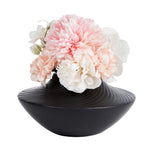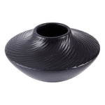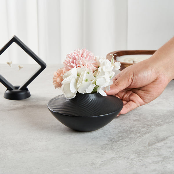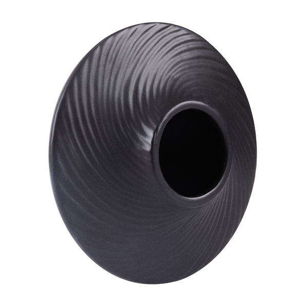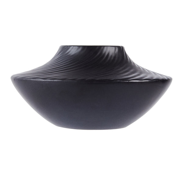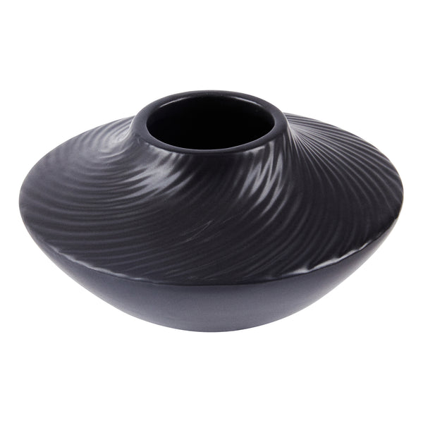 Enhance your space with timeless elegance using our Table Art Black Ceramic Swirl Vase. This ceramic vase has an exquisite swirl pattern, ideal for showcasing abundant bouquets or bold floral arrangements, making it perfect for adding a statement piece to your decor. Boasting a classic black color, this flower vase effortlessly complements any decor style with its sleek design. This decorative vase is crafted from premium ceramic for long-lasting durability and sturdiness. With a stable base, this centerpiece vase minimizes the risk of tipping over and keeps your floral arrangements intact. This table vase is suitable for various settings, from office spaces to living rooms, adding a touch of sophistication and style wherever it's placed. The versatile design of this black vase can be used to display your favorite blooms or simply serve as a standalone decorative piece. This black ceramic vase can be hand washed with soap and water, facilitating simple maintenance. Measuring 5.3 inches in diameter by 2.8 inches in height, this black flower vase is the perfect size for enhancing any table setting. Sold in a 1 count box.