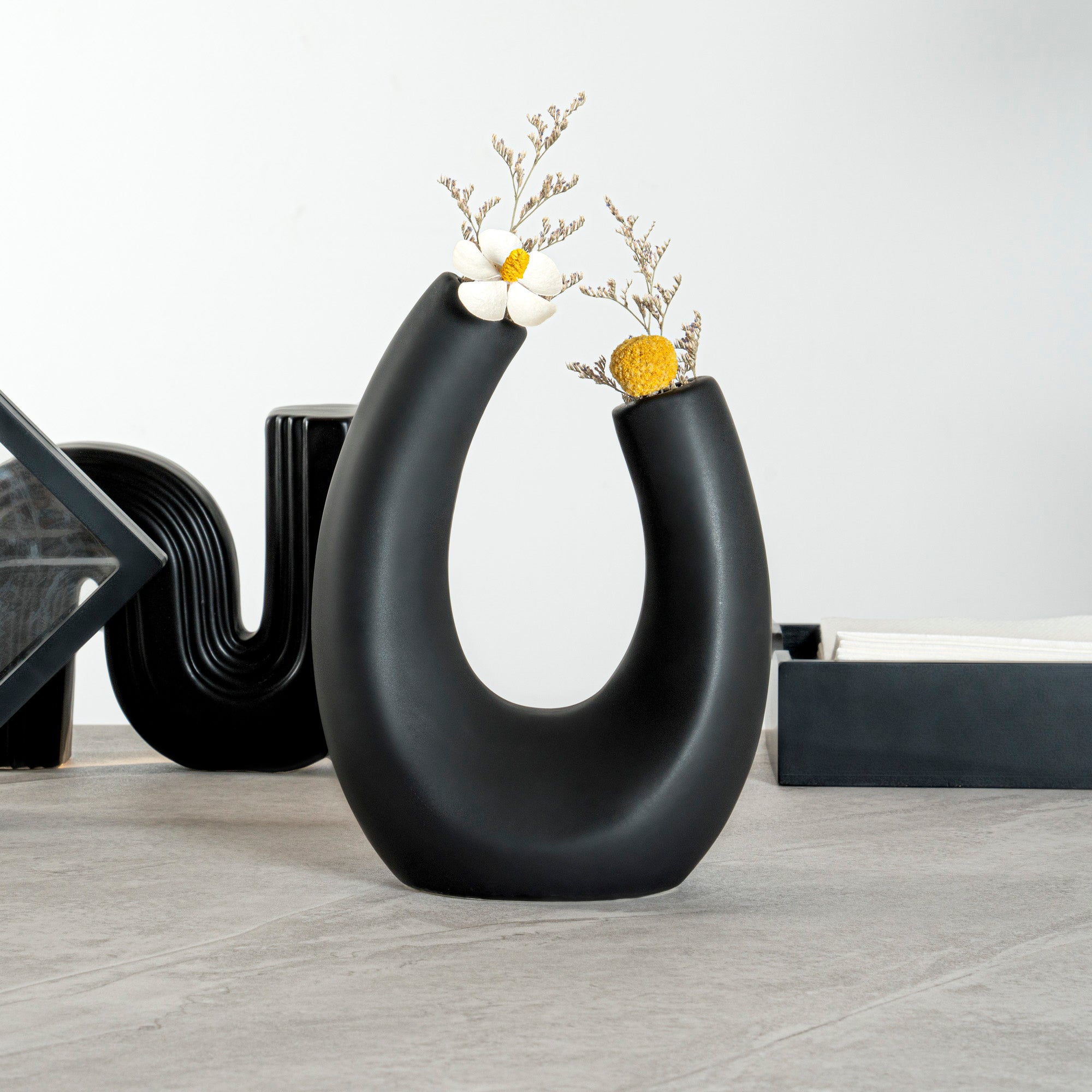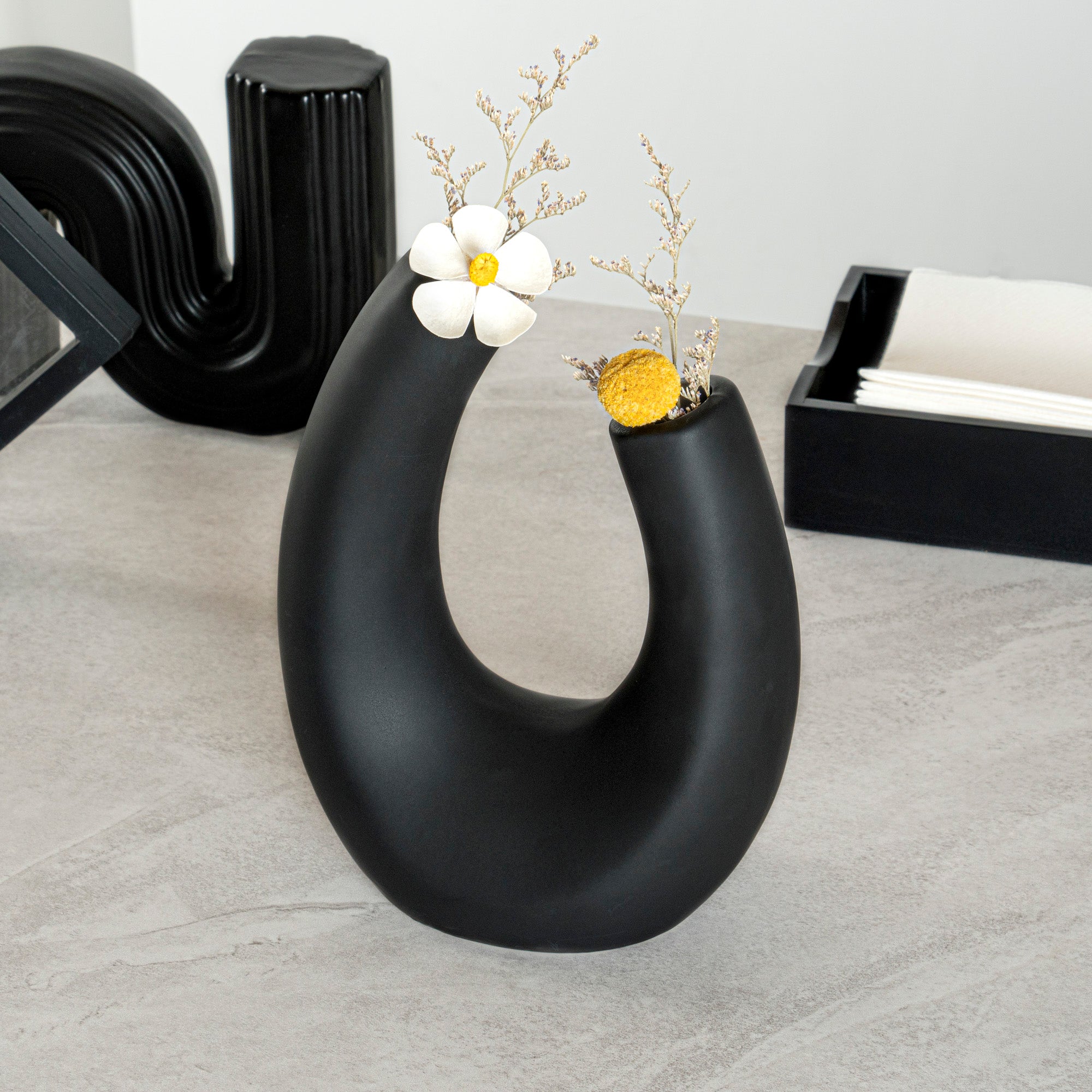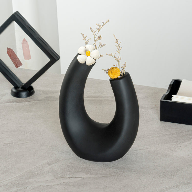 Style your office space with our Table Art Black Ceramic U-Shaped Vase. Featuring a unique U-inspired design, this ceramic vase combines modern aesthetics with artistic flair, creating a captivating centerpiece for any decor. The black finish of this flower vase adds a touch of contemporary elegance, making it a stylish choice for any modern decor. Created from premium ceramic, this decorative vase is durable and sturdy, making it ideal for long-lasting use at your home or office. The stable base of this centerpiece vase minimizes the risk of tipping over and keeps your floral arrangements intact. This table vase complements various decor styles, ranging from traditional to contemporary. The versatile design of this black vase makes it suitable as a centerpiece or a vessel for flowers, enhancing the aesthetic of any setting with its modern elegance. This black ceramic vase can be hand washed to maintain its pristine appearance, facilitating easy upkeep. Measuring 6.5 inches in length by 3 inches in width by 8.75 inches in height, this stylish vase fits perfectly in various settings. Sold in a 1 count box.