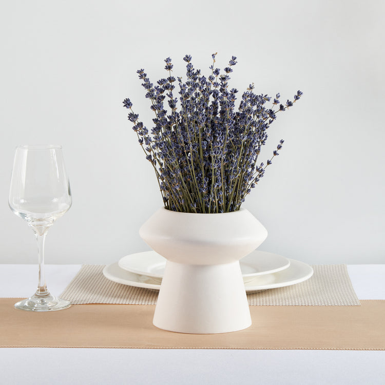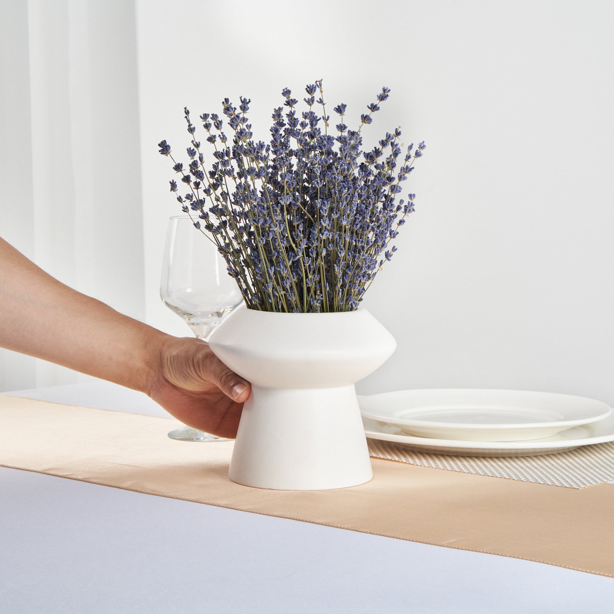 Stylishly enhance your living room with our Table Art White Ceramic Mushroom Vase. This ceramic vase features a mushroom-inspired design and complements any space with minimalist elegance. Boasting a classic white color, this flower vase creates a clean and timeless aesthetic, perfect for any decor. This decorative vase has a raised base and minimizes the risk of tipping over, keeping your floral arrangements intact. Crafted from premium ceramic, this centerpiece vase boasts durability and sturdiness for long-lasting use. This table vase complements a wide variety of settings, from chic office spaces to cozy living rooms. The versatile design of this white vase allows you to use it as a standalone centerpiece or vessel to hold your vibrant floral arrangements. This white ceramic vase can be hand washed with soap and water, facilitating easy upkeep and maintenance. Measuring 6.3 inches in diameter by 5.9 inches in height, this white decorative vase is perfect for holding different types of flowers. Sold in a 1 count box.
