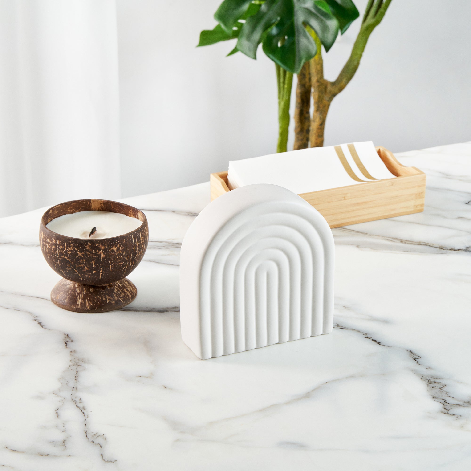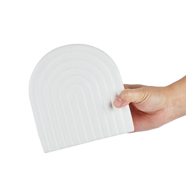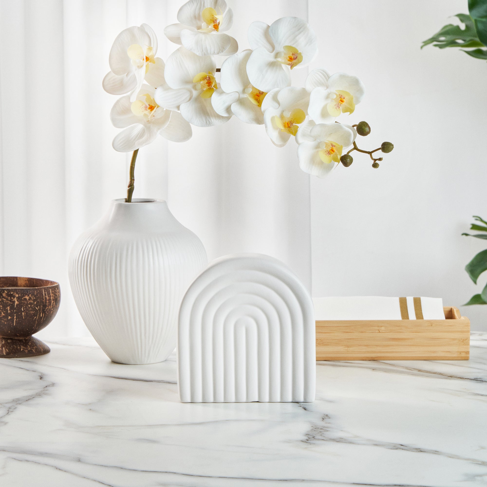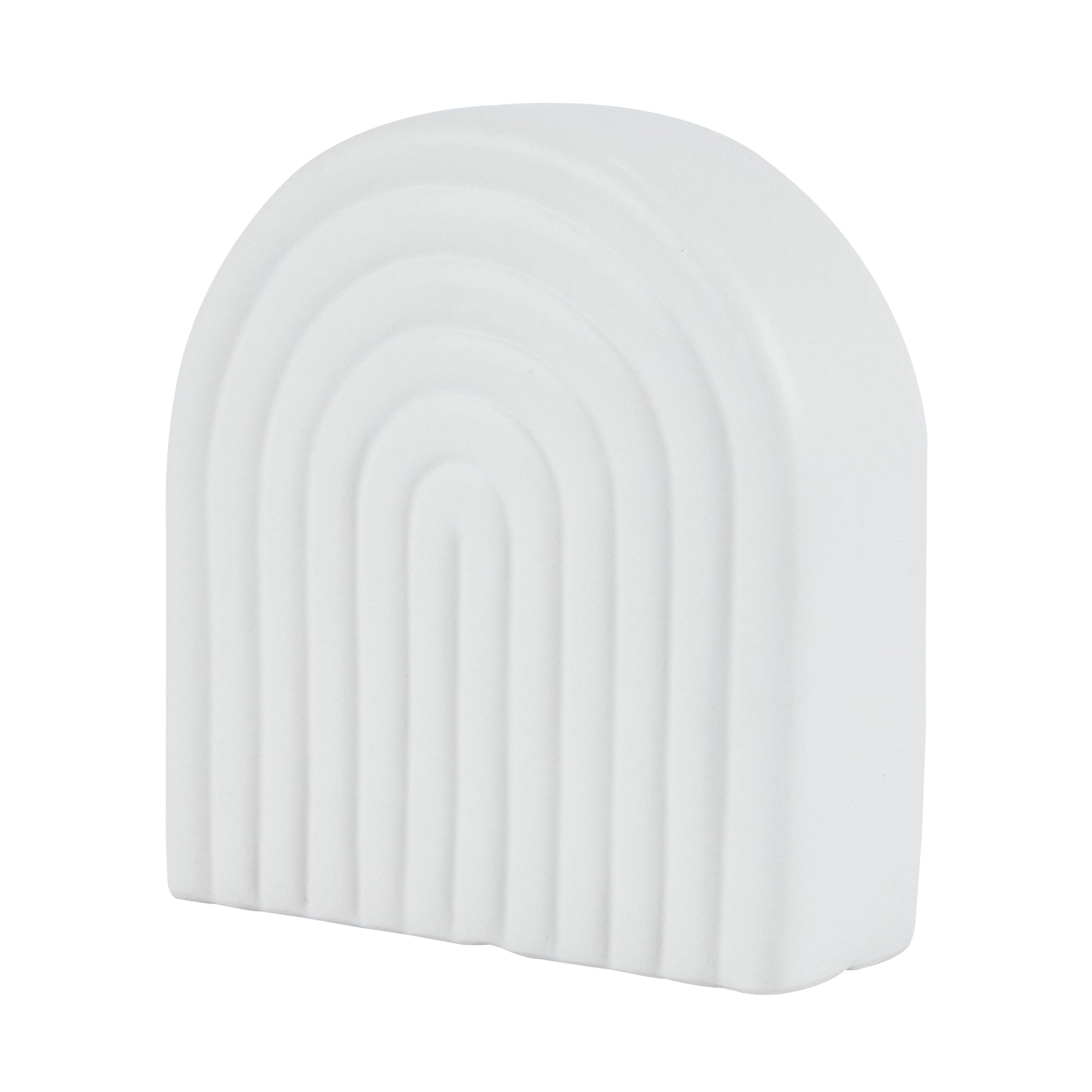 Enhance your decor with our Table Art White Ceramic Rainbow Vase. This ceramic vase showcases an exquisite design, capturing attention with its intricate details and timeless elegance. Boasting a classic white color, this flower vase radiates timeless charm, effortlessly enhancing the beauty of any floral arrangement or decorative display. Made from premium ceramic, this decorative vase is durable and sturdy, ideal for maintaining its pristine appearance. With a stable base, this centerpiece vase reduces the risk of tipping over, ensuring your display stays intact. This table vase complements a range of settings, from dining rooms to chic offices, enhancing their ambiance effortlessly. With a versatile design, this white vase functions as a standalone centerpiece or to showcase floral and dried arrangements with elegance. This white ceramic vase can be hand washed with soap and water, simplifying maintenance and keeping your space looking fresh. Measuring 6.1 inches in length by 2.1 inches in width by 6.3 inches in height, this white flower vase fits perfectly in any space while making a bold statement. Sold in a 1 count box.