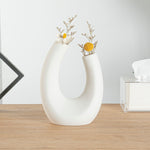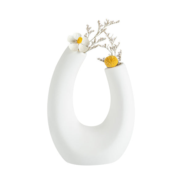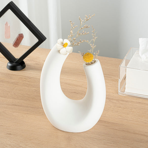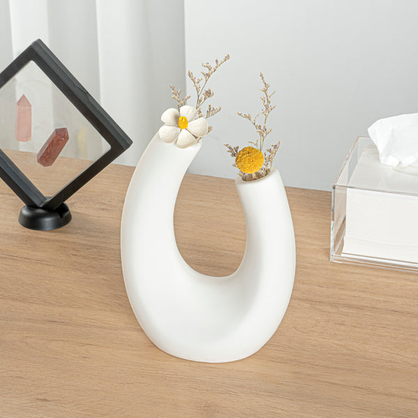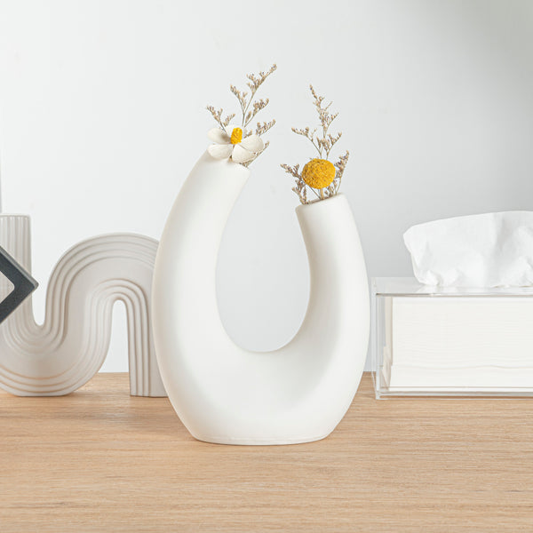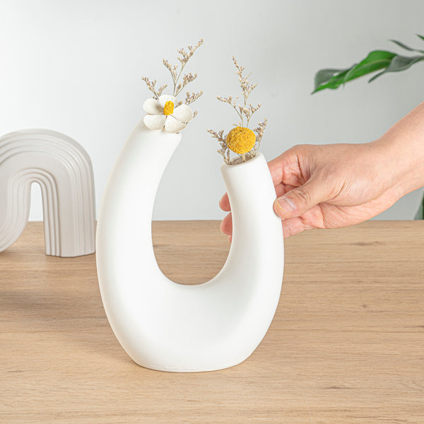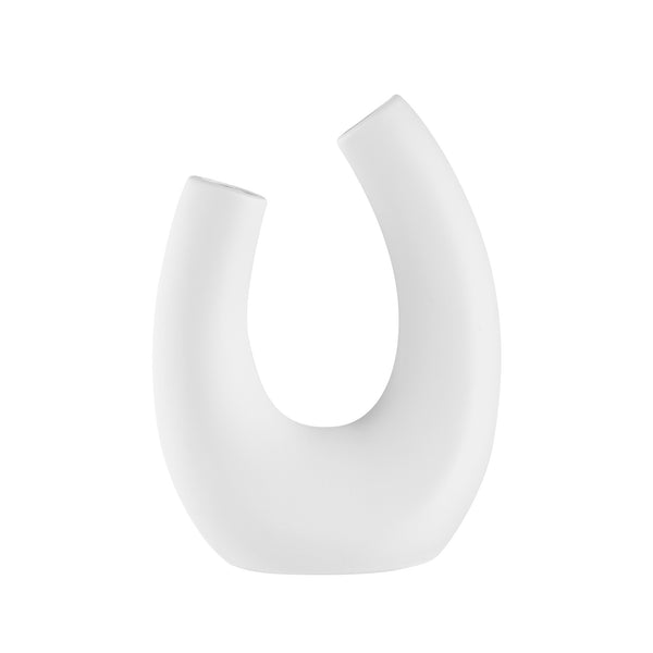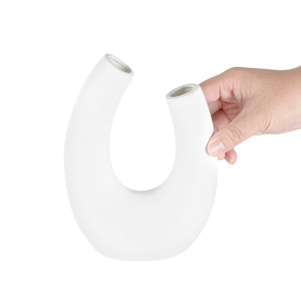 Enhance any space with our Table Art White Ceramic U-Shaped Vase. This ceramic vase features a U-inspired design that highlights its graceful curves, adding a unique and artistic flair to any space. With a classic white finish, this flower vase exudes timeless elegance, perfect for complementing any decor with its clean and sophisticated appearance. Created from premium ceramic, this decorative vase boasts long-lasting durability and sturdiness. The stable base of this white decorative vase minimizes the risk of tipping over and keeps your floral arrangements intact. This centerpiece vase complements various decor styles, from chic office spaces to traditional living rooms. The versatile design of this table vase allows it to serve as a stylish centerpiece or as a functional vessel for flowers. This white ceramic vase can be hand washed to facilitate easy upkeep for its pristine appearance. Measuring 6.5 inches in length by 3 inches in width by 8.75 inches in height, this white vase fits perfectly in various spaces. Sold in a 1 count box.