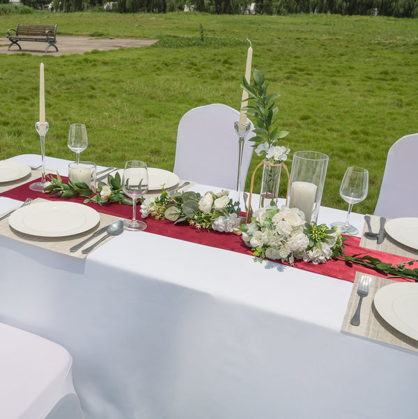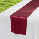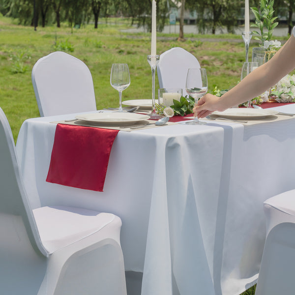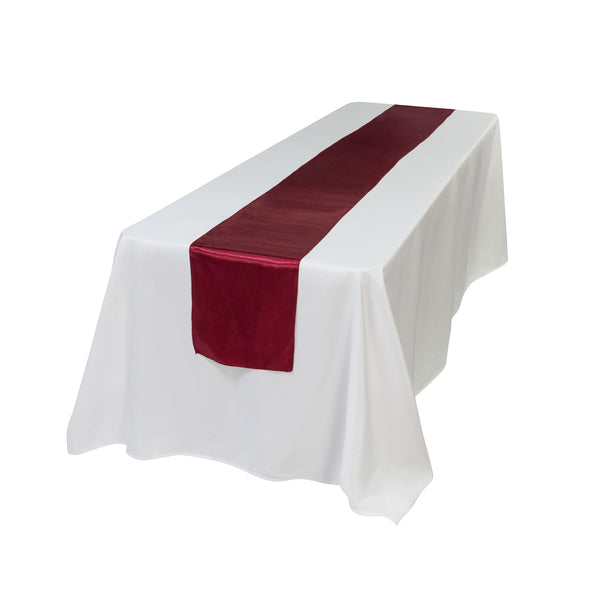 Give your tablescapes a high-end look with our Table Tek Dark Burgundy Satin Table Runners. Featuring a dark burgundy finish, these dining table runners add elegance to your dining tables. With a satin weave, these wedding table runners have a beautiful luster to catch the eyes of your guests. With a one-piece design, these create a seamless appearance so you can easily create clean and sophisticated table settings. These table runners for parties are machine-washable on the gentle cycle with cold water. To maintain their high-quality look, these fabric table runners can not be washed with bleach. Ideal for avoiding wrinkles and creases, these tablecloths can be put in the dryer on a medium heat setting. These satin table runners measure 12 inches long by 108 inches wide. Sold in a 10 count box.