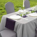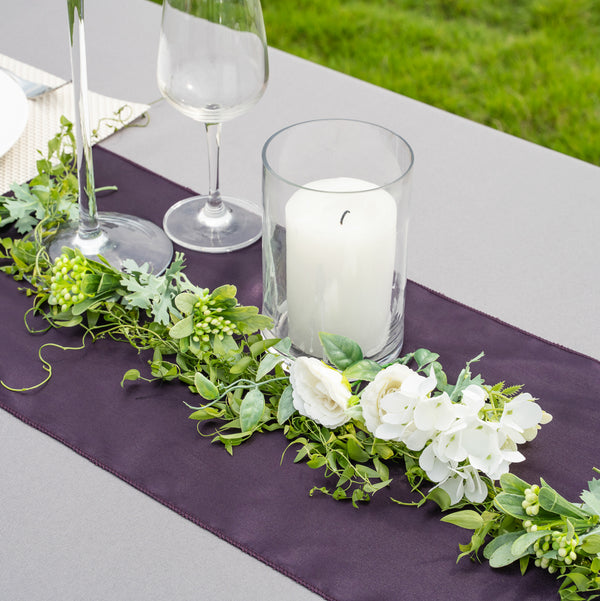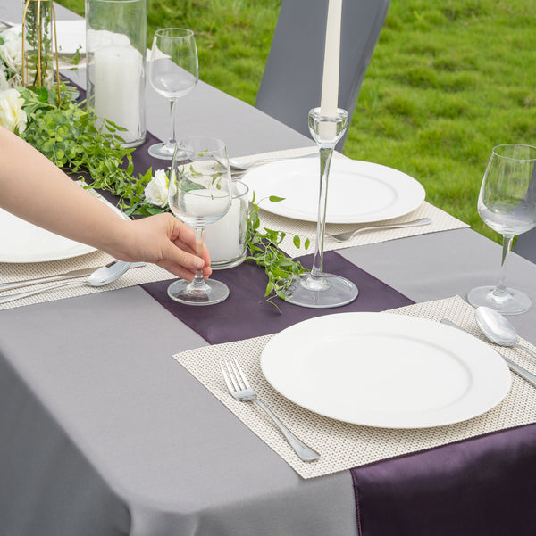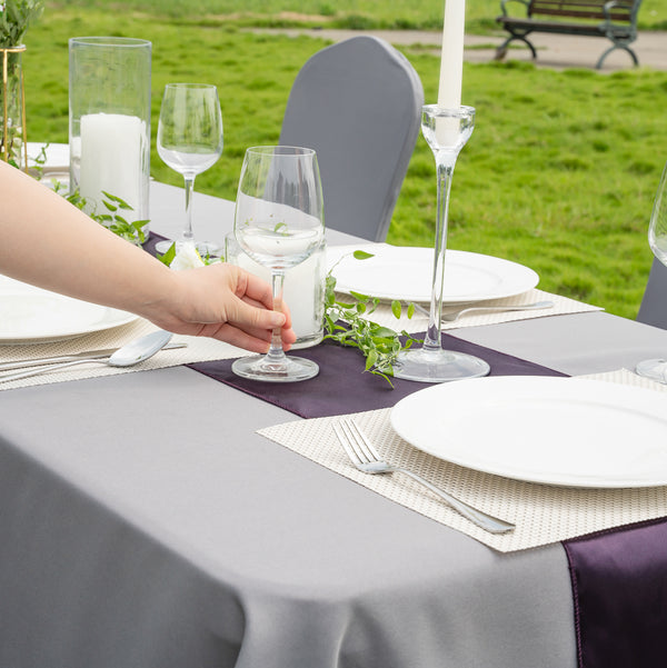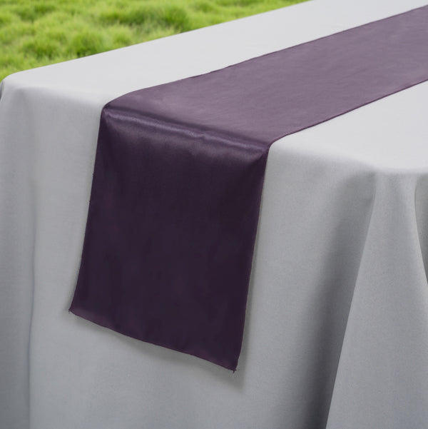 Match the decorations at your catered event using our Table Tek Dark Purple Satin Table Runner. Featuring a satin weave, this purple table runner has a bright shine that will instantly catch the eyes of guests. This dining table runner is made with high-quality polyester and has a seamless one-piece design so you can elevate your table presentations. This decorative table runner is machine-washable in the gentle cycle with cold water for a convenient way to clean and reuse countless times. Put this dining table runner through the dryer using a medium heat setting to help keep it withoutwrinkles. Great for tables at banquets or restaurants, this dark purple table runner measures 108 inches in length by 12 inches in width. Do not use bleach to keep this table runner looking new. Sold in a 1 count box.