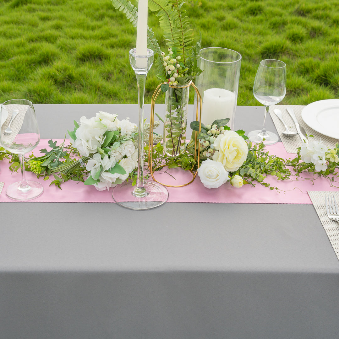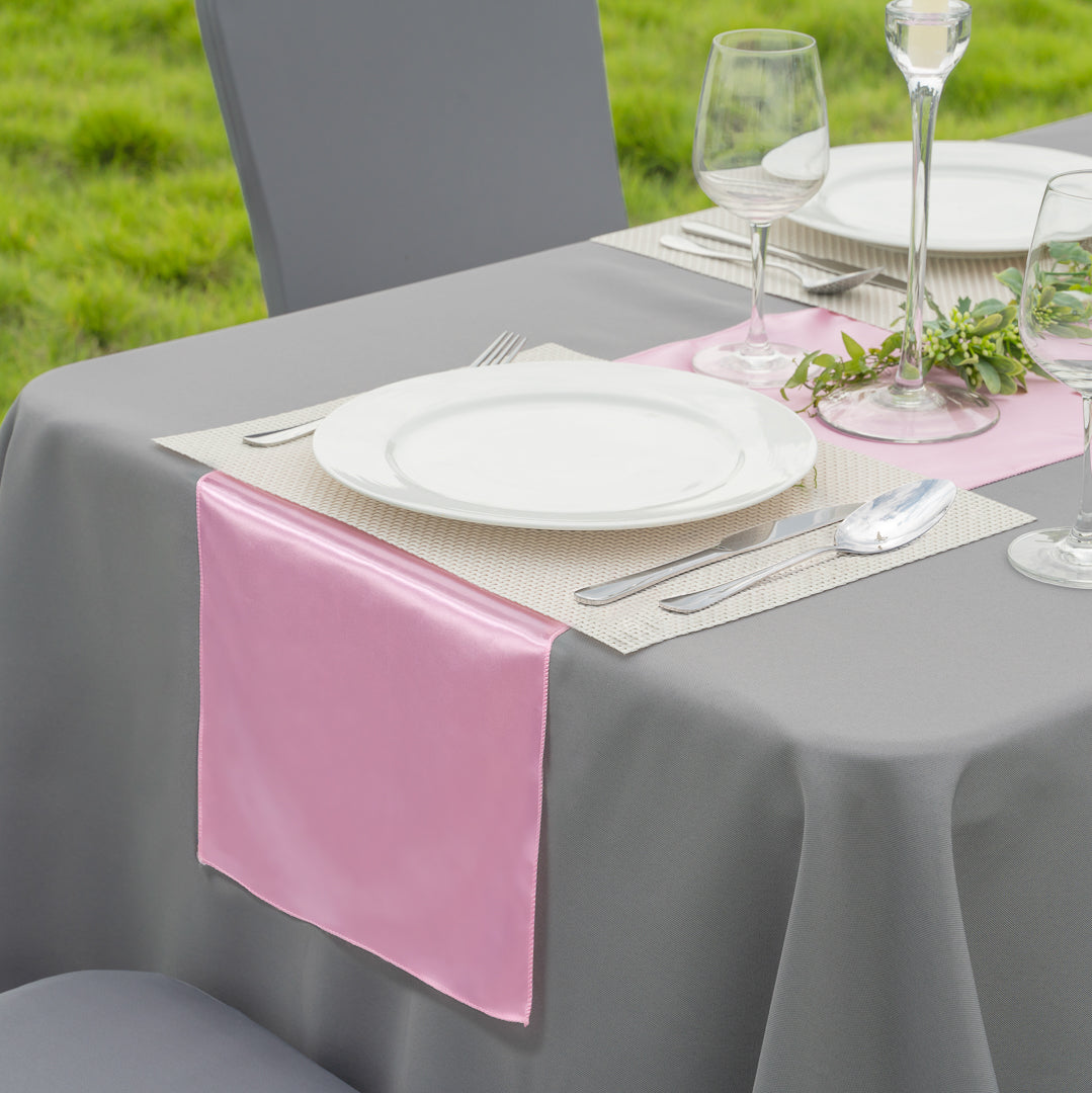 Bring elegance to tables at weddings or bridal showers using our Table Tek Light Pink Satin Table Runners. Designed with a light pink finish and satin weave, these party table runners add a beautiful look to tablescapes and events. Crafted from premium polyester, these wedding table runners have a one-piece design that allows you to quickly put together tables before guests arrive. These seamless table runners are machine-washable in the gentle cycle with cold water for an easy way to clean them after use. To help protect against wrinkles, these wedding table runners can be put in a dryer using a medium heat setting. These light pink table runners measure 108 inches in length by 12 inches in width. Do not use bleach to keep these runners looking new. Shipped in a 10 count box.