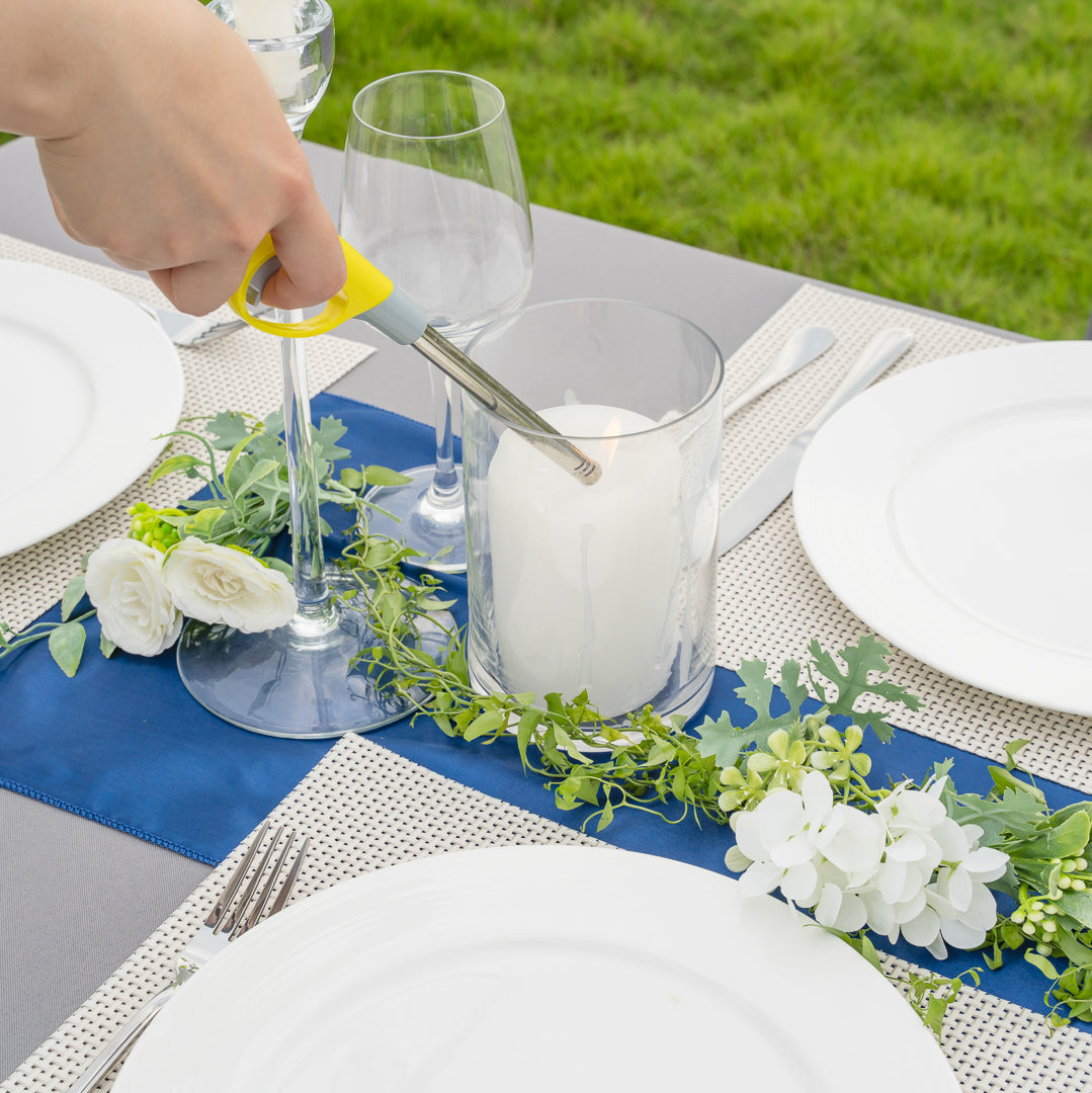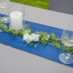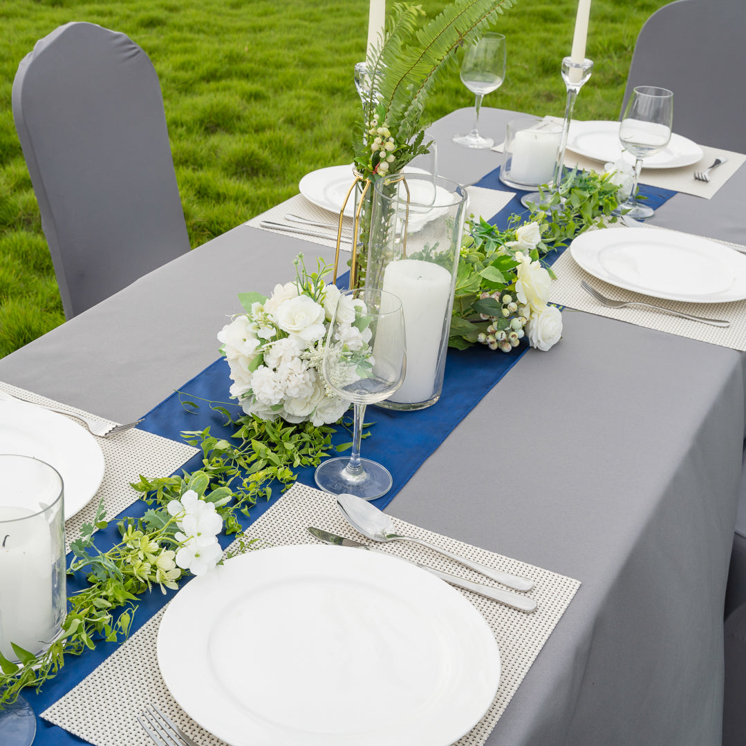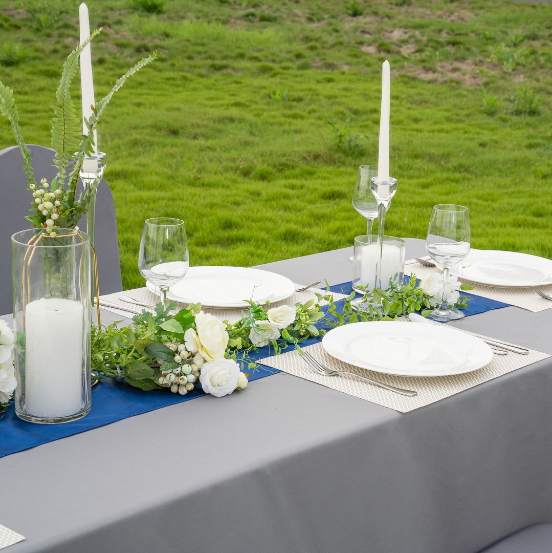 Add the finishing touch to tablescapes using our Table Tek Navy Blue Satin Table Runners. Featuring a satin weave and navy blue finish, these table runners have an eye-catching shine that is sure to impress your guests. Made with high-quality polyester, the one-piece design of these navy table runners creates a seamless appearance and is ideal for quickly arranging elegant table settings. These blue table runners are machine-washable for an easy way to clean them after events. Help avoid wrinkles after washing by drying these table runners on a medium heat setting. Great for tables of all sizes, these blue table runners measure 108 inches in length by 12 inches in width. Do not use bleach to keep these runners looking new. Sold in a 10 count box.