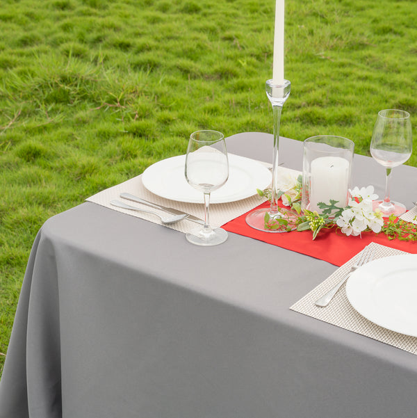 Our Table Tek Rectangle Gray Polyester Cloth Tables Cover elevates the look of your dining table. Crafted from durable polyester, this table cover is stain-resistant so you can easily wipe away any smudges or spots. With hemmed edges, this gray tablecloth won't unravel to maintain its high-quality appearance. This hemmed table cover is wrinkle-free to spend less time ironing and more time setting up tables. Designed with a gray finish, this dining room tablecloth makes the bright colors of your tableware or meals stand out. To easily clean after use, this hemmed table cover is machine-washable in the gentle cycle with cold water and should be hung to dry. It is advised not to use bleach when washing this tablecloth. Measuring 90 inches long by 132 inches wide, this tablecloth is perfect for rectangular tables. Sold in a 1 count box.