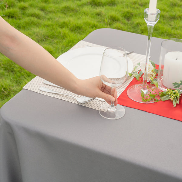 Our Table Tek Rectangle Gray Polyester Cloth Tables Covers elevate the look of your dining tables. Crafted from durable polyester, these table covers are stain-resistant so you can easily wipe away any smudges or spots. With hemmed edges, these gray tablecloths won't unravel to maintain their high-quality appearance. This hemmed table cover is wrinkle-free to avoid spending time ironing and more time setting up tables. Designed with a gray finish, these dining room tablecloths make the bright colors of your tableware or meals stand out. To easily clean after use, these hemmed table covers are machine-washable in the gentle cycle with cold water and should be hung to dry. It is advised not to use bleach when washing these tablecloths. Measuring 90 inches long by 132 inches wide, these tablecloths are perfect for rectangular tables. Sold in a 10 count box.