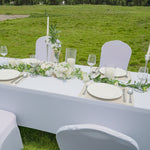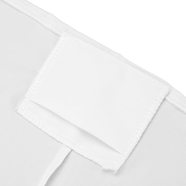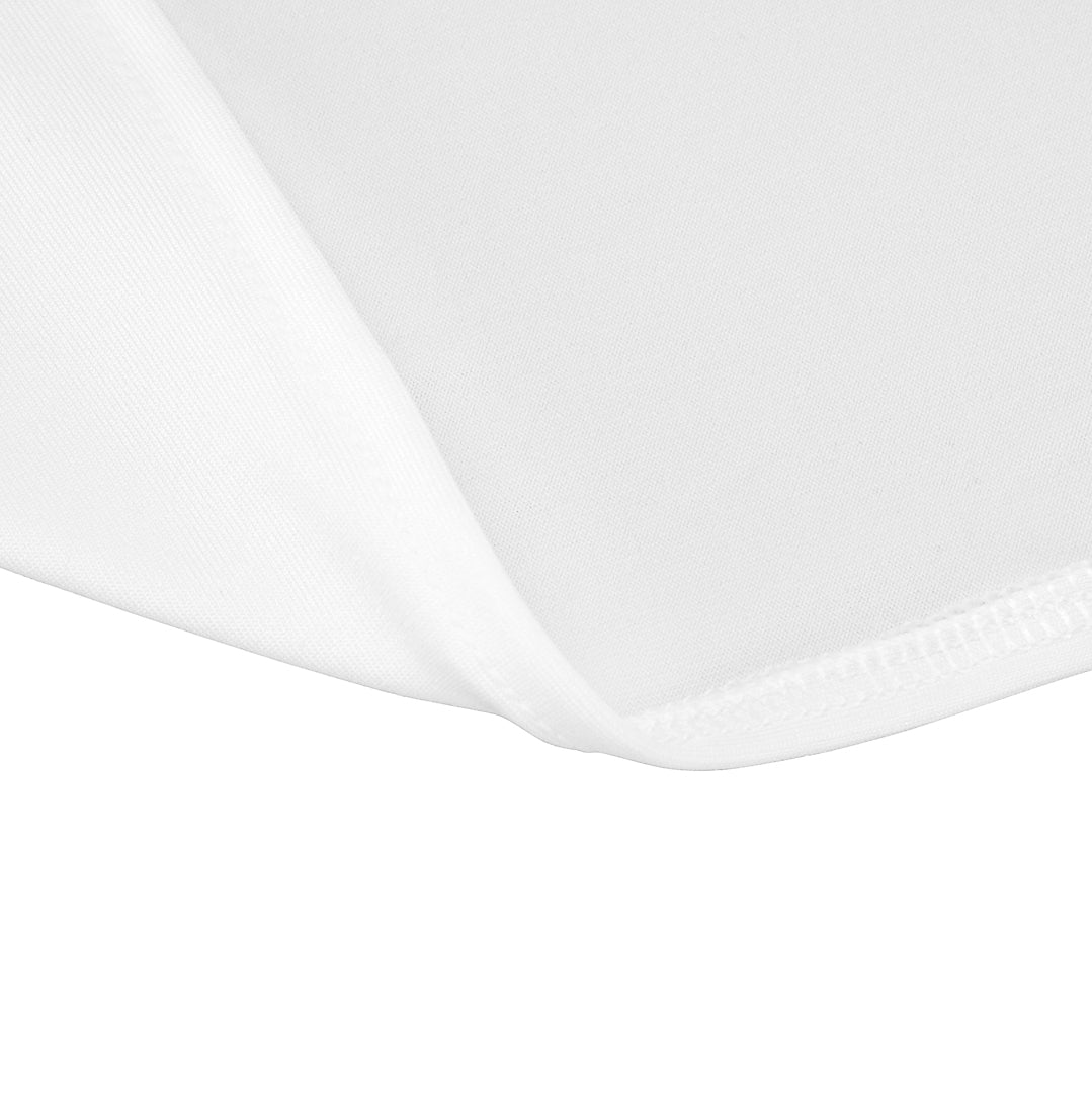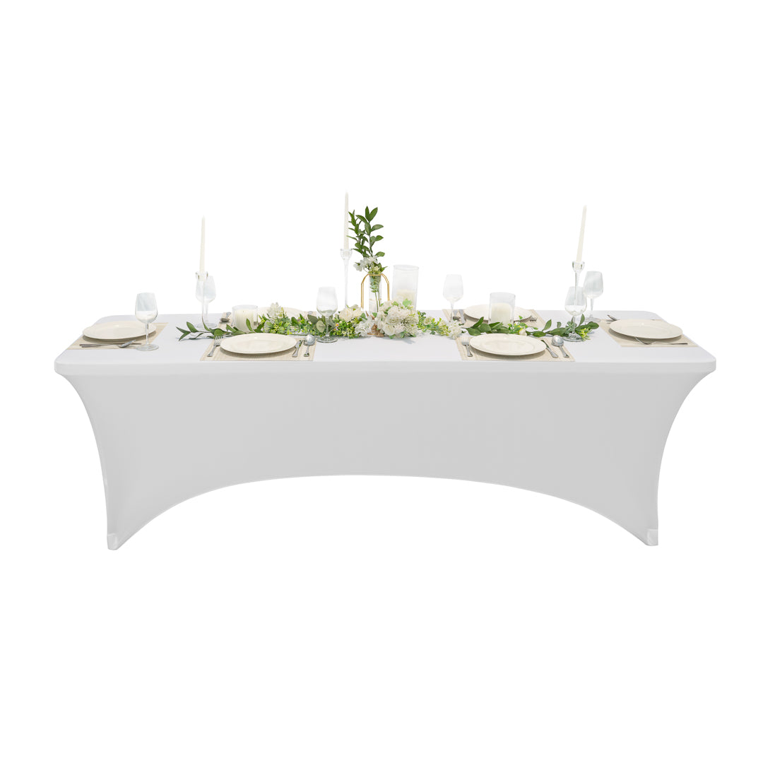 Protect your party table using our Table Tek Rectangle White Spandex Table Cover. This table cover is ideal for tables that measure 96 inches in length and 30 inches in width. Made from a blend of spandex and polyester and featuring a contour cut, this cloth for tables easily stretches to completely cover tables. This white tablecloth is designed with foot pockets that tightly fit onto table legs and keep the cover in place. Perfect for avoiding long-lasting damage, this table cover is conveniently stain-resistant. To keep the fabric looking neat in between uses, this cloth for tables is wrinkle-resistant. This white tablecloth can be machine washed in a gentle cycle with cold water and air-dried for easy cleaning. It is recommended not to bleach this spandex cover to maintain its quality. This table cover measures 96 inches in diameter by 30 inches in height. Shipped in a 1 count box.