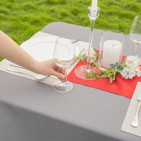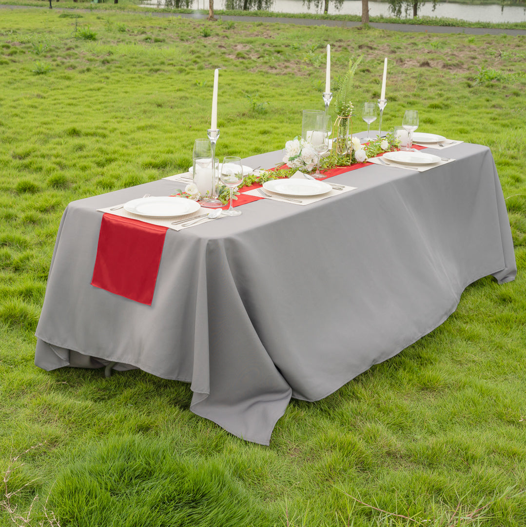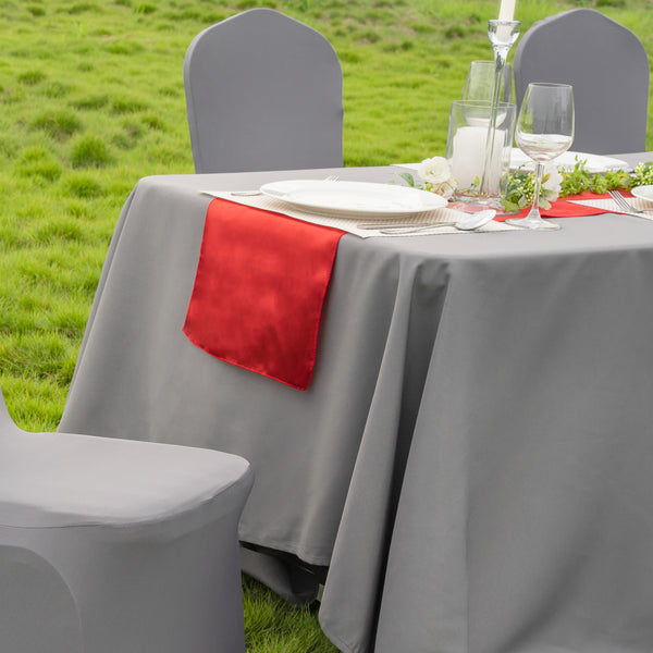 Decorate tables with elegance using our Table Tek Red Satin Table Runner. The red finish and satin weave of this fall table runner adds a bright shine to the decor at catered celebrations. This kitchen table runner features a seamless one-piece design so you can arrange your table with ease. Made from high-quality polyester, this red table runner is machine-washable in the gentle cycle with cold water for a quick way to keep it clean in between uses. To help avoid wrinkles after washing, simply run this red table runner through the dryer at a medium heat setting. This kitchen table runner measures 108 inches in length and 12 inches in width. To maintain its stunning appearance, do not bleach this table runner. Shipped in a 1 count box.