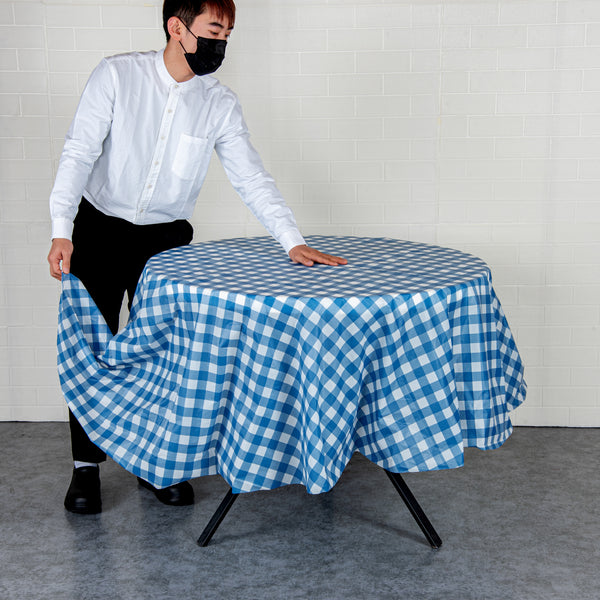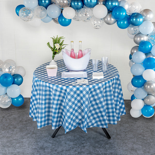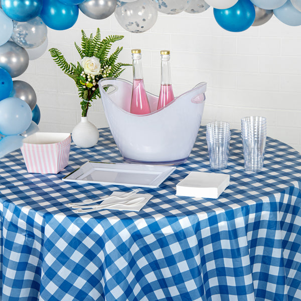 Transform any event with our Table Tek Round Blue Gingham Plastic Table Covers. Perfect for both indoor and outdoor events, these plastic table covers are durable. Showcasing a unique blue gingham print, these disposable table covers provide a chic look that's sure to impress your guests. Crafted from waterproof plastic, these table covers are designed to protect your tables from spills and stains, making clean-up a breeze. With the wrinkle-resistant feature, these table covers always maintain a neat and tidy appearance, ideal for all kinds of events. With a generous diameter of 84 inches, these round table covers are designed to fit a wide range of tables, adding versatility to your event planning. Sold in a 2 count box.
