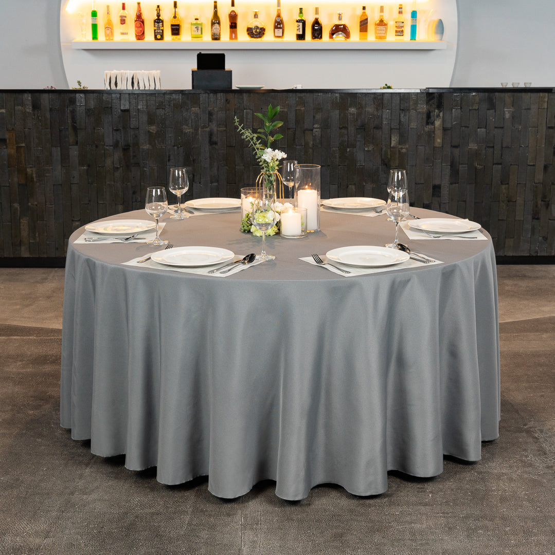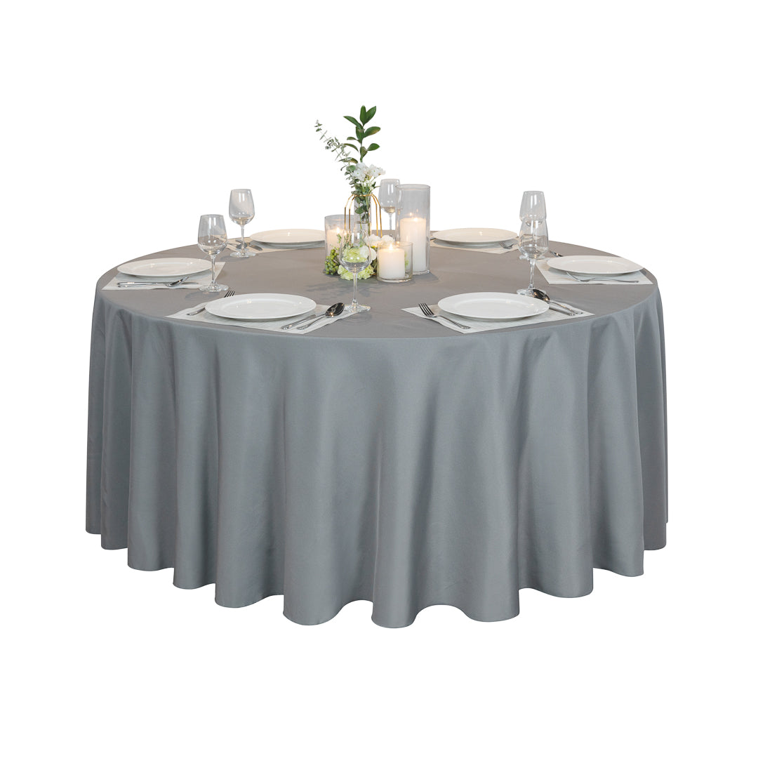 Provide any table at your restaurant or catered event with a touch of elegance using our Table Tek Round Gray Polyester Cloth Table Cover. This large tablecloth is designed to protect a round table that measures 120 inches in diameter. With a hemmed design, this wedding tablecloth elegantly drapes over table legs and prevents fraying. Made from high-quality polyester, this hemmed table protector is stain-resistant to prevent accidental spills from damaging it. This round table protector features a gray finish that gives tables a sophisticated look while complementing centerpieces. Conveniently wrinkle-free, this round polyester table cover eliminates the hassle of ironing the cover to remove creases before each use. For fast and easy cleaning after events, this gray tablecloth can be machine washed in a gentle cycle with cold water and air-dried. You should not use bleach to clean this large, round tablecloth to maintain its exceptional quality for everyday use. Shipped in a 1 count box.