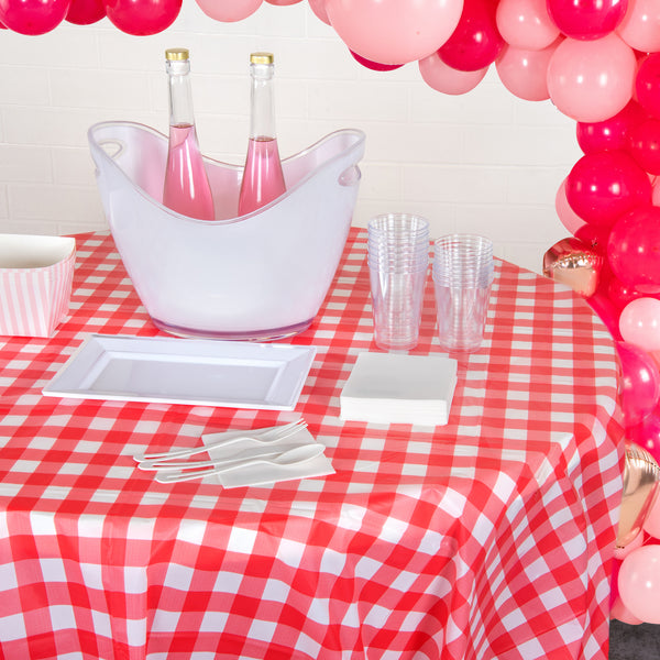 Transform your setting with our Table Tek Round Red Gingham Plastic Table Covers. These red table covers add a vibrant touch that is sure to catch the eye of your guests. Made from durable material, these plastic table covers withstand spills and stains, making them perfect for any event. Being waterproof, these table covers are ideal for both indoor and outdoor events, protecting your tables from unexpected weather or spills. The wrinkle-resistant feature of these round table covers ensures your tables always look neat and appealing. With a generous size of 84 inches in diameter, these round table covers are perfect for large round tables, accommodating all kinds of events. Sold in a 2 count box.