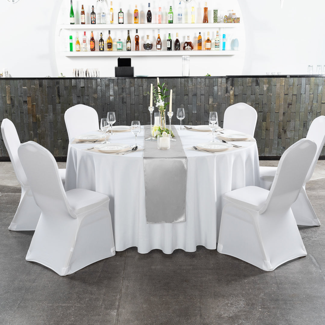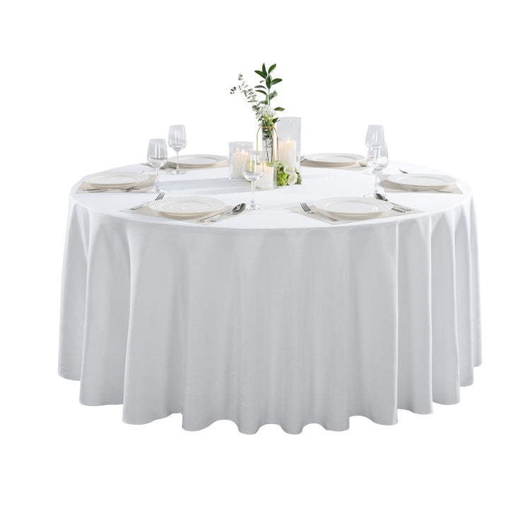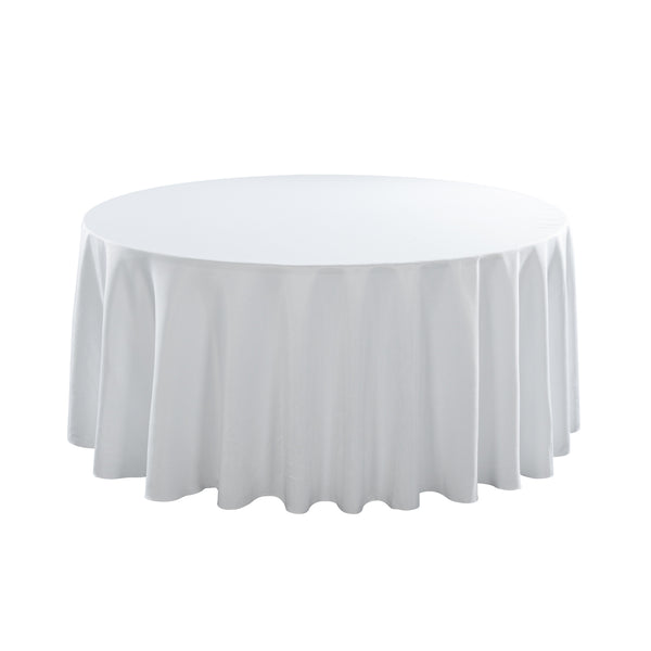 Have tables complement the decor of any wedding or banquet using our Table Tek Round White Polyester Cloth Table Covers. These hemmed table protectors are designed to drape over table legs and cover round tables that measure 120 inches in diameter. Featuring a classic white finish, these round table covers give tables a sophisticated look while making place settings stand out. These polyester tablecloths are wrinkle-free to eliminate the worry of ironing each table cover before events. To maintain their white finish for numerous indoor and outdoor events, these durable table covers are stain-resistant. These hemmed tablecloths can be machine washed in a gentle cycle with cold water and air-dried to make cleaning a breeze. It is recommended not to bleach these polyester table covers to avoid damages. Sold in a 10 count box.