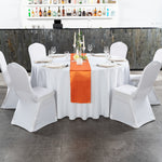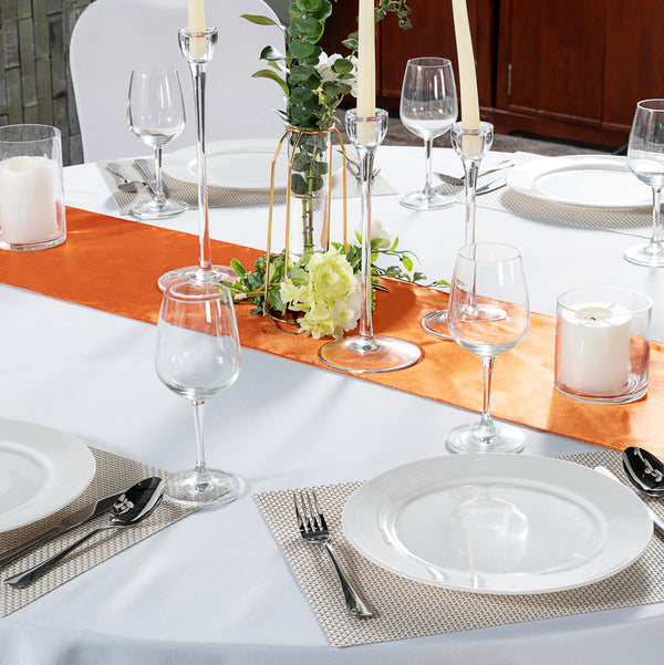 Complement the decorations at your event using our Table Tek Tangerine Orange Satin Table Runners. Made with high-quality polyester, these orange table runners are perfect for everyday use at your restaurant or catered event. Featuring a one-piece design, these dining table runners are seamless and simplify the process of setting tables. The orange finish and satin weave of these orange runners for tables are perfect for matching the decor at your foodservice establishment. Conveniently easy to clean, these orange table runners are machine-washable in the gentle cycle with cold water. These dining table runners can be tumble-dried using a medium heat setting so you can avoid the hassle of ironing. These table runners measure 108 inches in length and 12 inches in width. Do not use bleach on these orange table runners to keep their appearance looking new. Sold in a 10 count box.