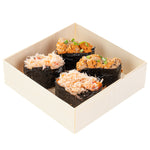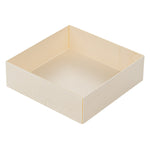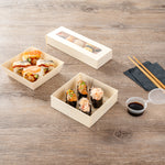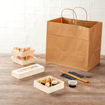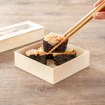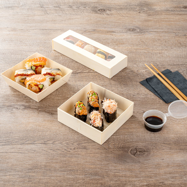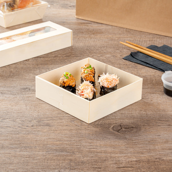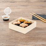 Display dishes in eco-friendly flair using our Taipei 17-ounce Square Poplar Straight Containers. Crafted from sturdy poplar, these disposable to go containers are commercially compostable and biodegradable to ensure a sustainable cleanup. With a glassine paper lining that is naturally grease-resistant and water-resistant, these take out boxes are ideal for carrying out pork dumplings, sushi rolls, wraps, and pastries. To securely take food on the go, these wooden food containers can be perfectly paired with our matching lids (SKU: RWB0387). The sturdy construction of these square to go food containers makes them a perfect choice for serving various hot or cold food items. These carry out containers are packaged flat for easy storage and equipped with adhesive strips for hassle-free assembly. Measuring 4.75 inches in length by 5 inches in width by 1.5 inches in height, these takeaway boxes can hold up to 17 ounces. Sold in a 100 count box. Lids are available and sold separately.