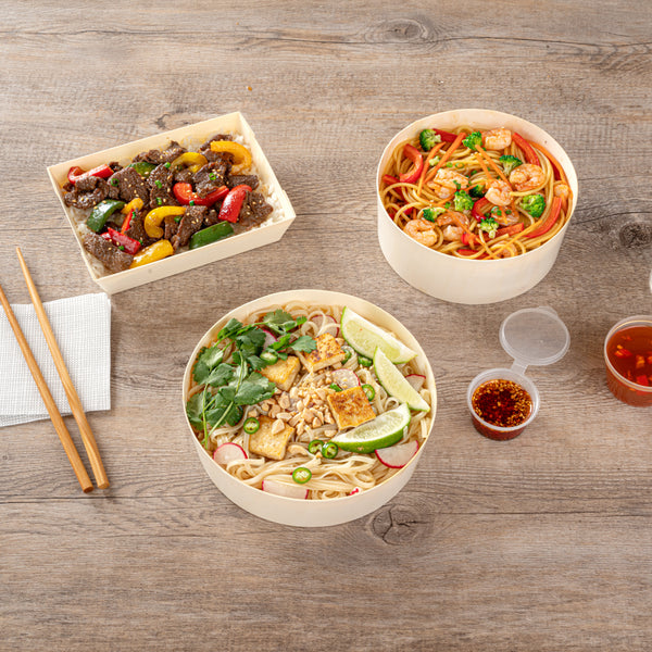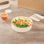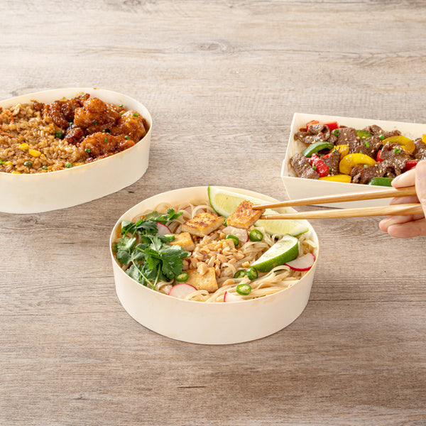 Innovatively showcase your fare with our Taipei 33-ounce Round Poplar Large Containers. Constructed from sustainable poplar wood, these carry out containers are commercially compostable and biodegradable to provide sustainable cleanup and alternatives to traditional styrofoam or plastic tableware. Featuring a glassine paper lining, these wooden food containers are conveniently water-resistant and grease-resistant to prevent unsightly messes at your restaurant, buffet, or catering event. The premium construction of these round take out food boxes makes them an excellent choice for serving various hot or cold food items. These takeaway boxes have a round shape that is ideal for packaging various appetizers, entrees, or other large portions. To securely transport your dishes pair these disposable to go containers with their coordinating lids (SKU: RWB0381). These take out boxes measure 6.75 inches in diameter by 1.75 inches in height and contain up to 33 ounces. Shipped in a 100 count box. These items will only degrade outside of the traditional solid. Lids are available and sold separately.