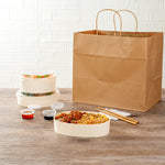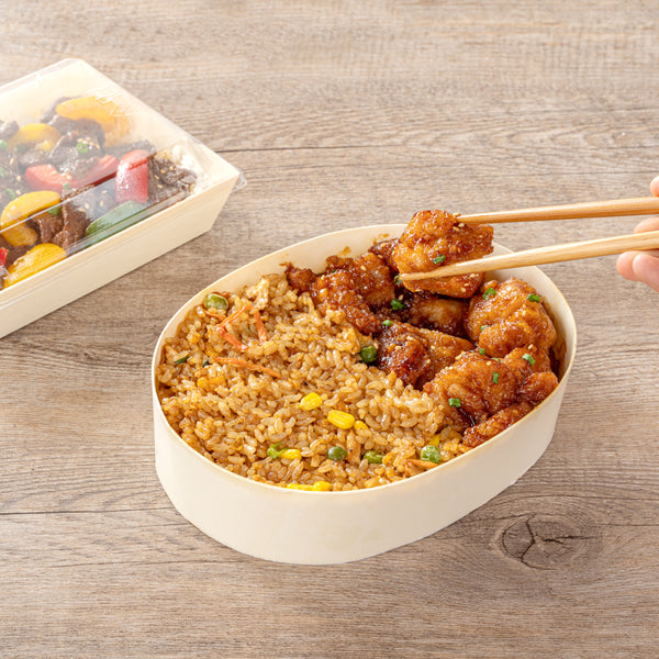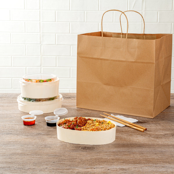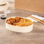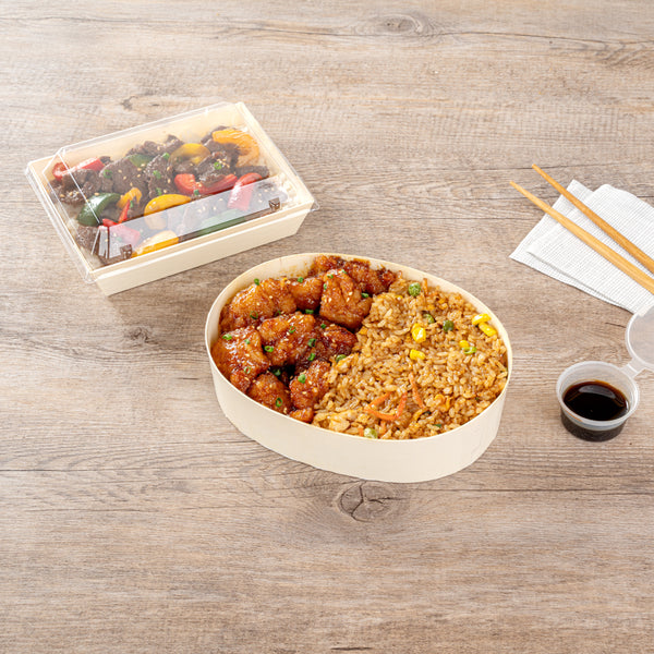 Bring nature-friendly elegance to your delicious entrees with our Taipei 38-ounce Oval Poplar Containers. Crafted from organic poplar wood, these disposable to go containers are commercially compostable and biodegradable for an environmentally friendly cleaning experience. Lined with glassine paper, these take out boxes are conveniently water-resistant and grease-resistant to provide a mess-free serving solution for your restaurant, buffet, or catering event. The sturdy construction of these oval take out food containers makes them a perfect choice for serving various hot or cold food items. These wooden food containers have a unique oval shape that is great for serving various hot or cold food items. To securely package your dishes, pair these carry out containers with their coordinating lids (SKU: RWB0385). These takeaway boxes measure 7.5 inches long by 5.5 inches wide by 2.25 inches tall and can contain up to 38 ounces. Shipped in a 100 count box. Lids are available and sold separately.