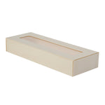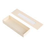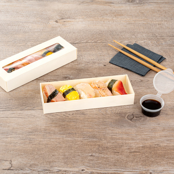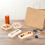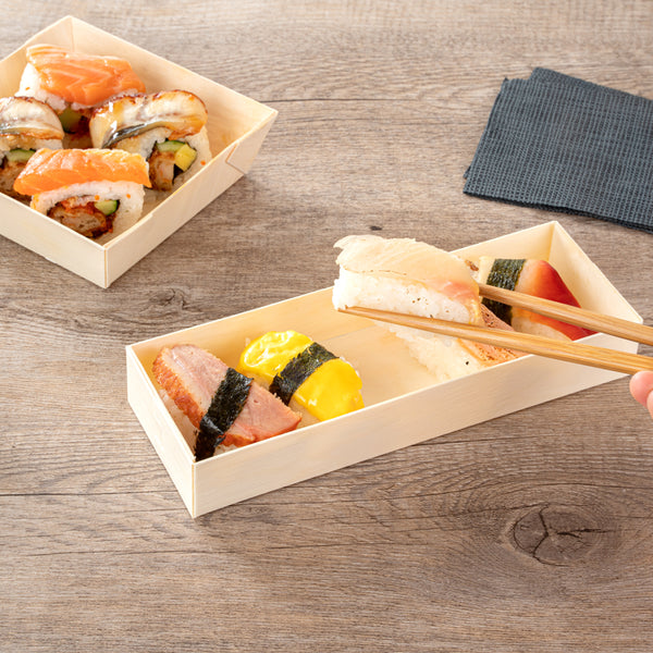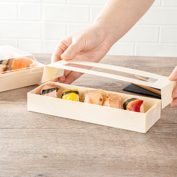 Serve sophistication and style to go with our Taipei 9-ounce Rectangle Poplar Containers. Crafted from poplar wood, these takeaway boxes are biodegradable and commercially compostable to ensure an environmentally responsible cleanup. These wooden food containers come with window flap lids to provide a secure seal for taking food on the go and feature a clear window display to showcase their contents. Featuring tough glassine paper lining, these carry out containers are naturally water-resistant and grease-resistant ensuring mess-free serving at your restaurant, buffet, and catering event. The sturdy construction of these disposable to go containers makes them suitable for serving various hot or cold food items. These take out boxes are packed flat for convenient storage and equipped with adhesive strips for quick and easy assembly. Each rectangular food container measures 8 inches long by 2.75 inches wide by 1.25 inches tall and can contain up to 9 ounces. The lids of these take out containers measure 7.75 inches long by 2.75 inches wide. Shipped in a 100 count box. These items will only degrade outside of the traditional solid.