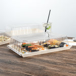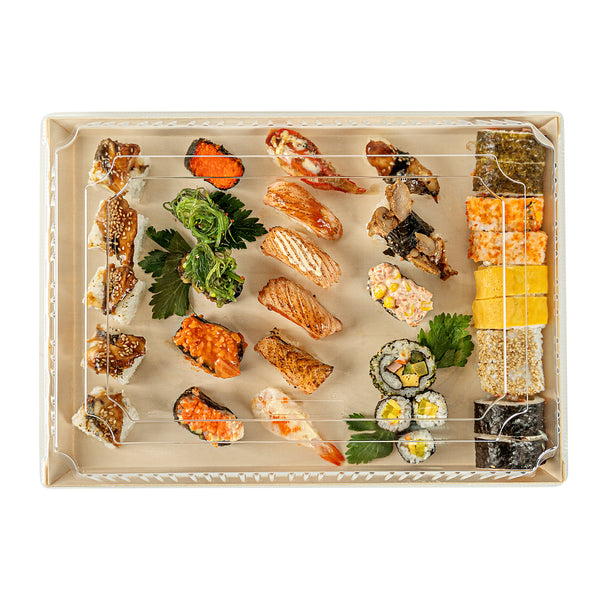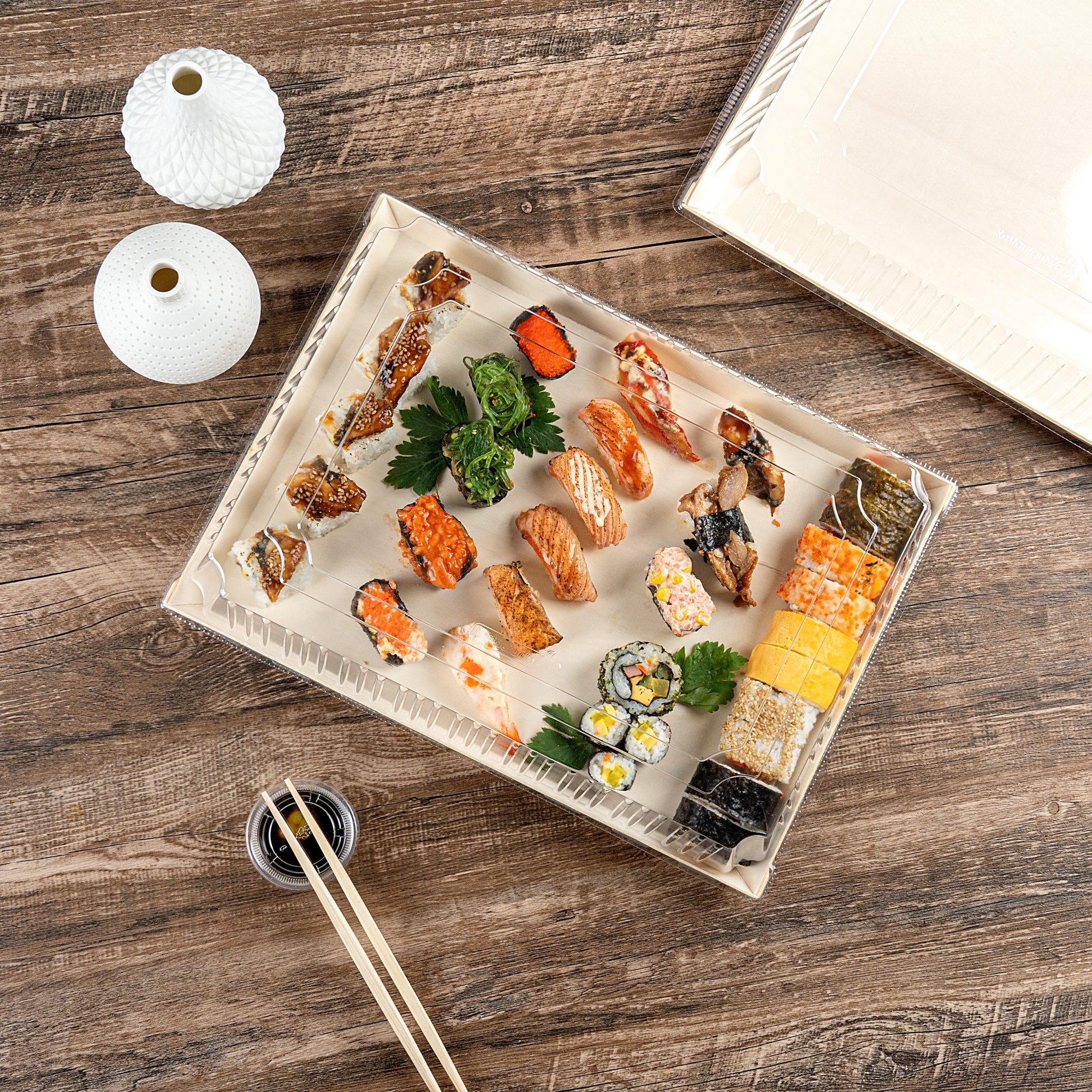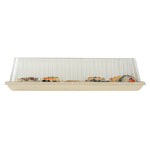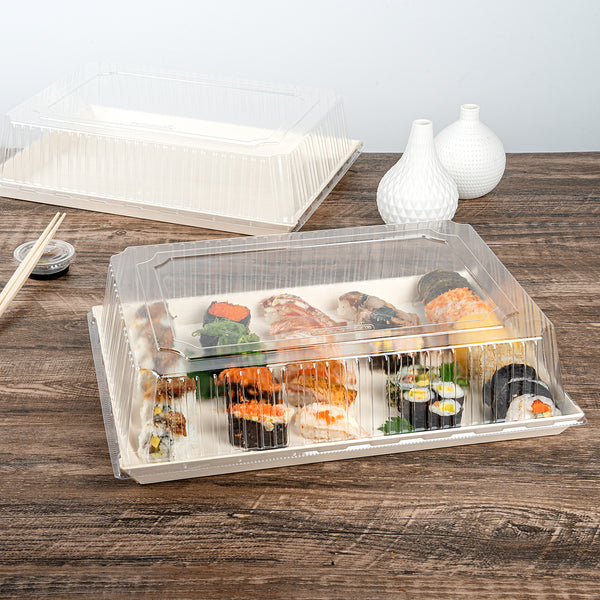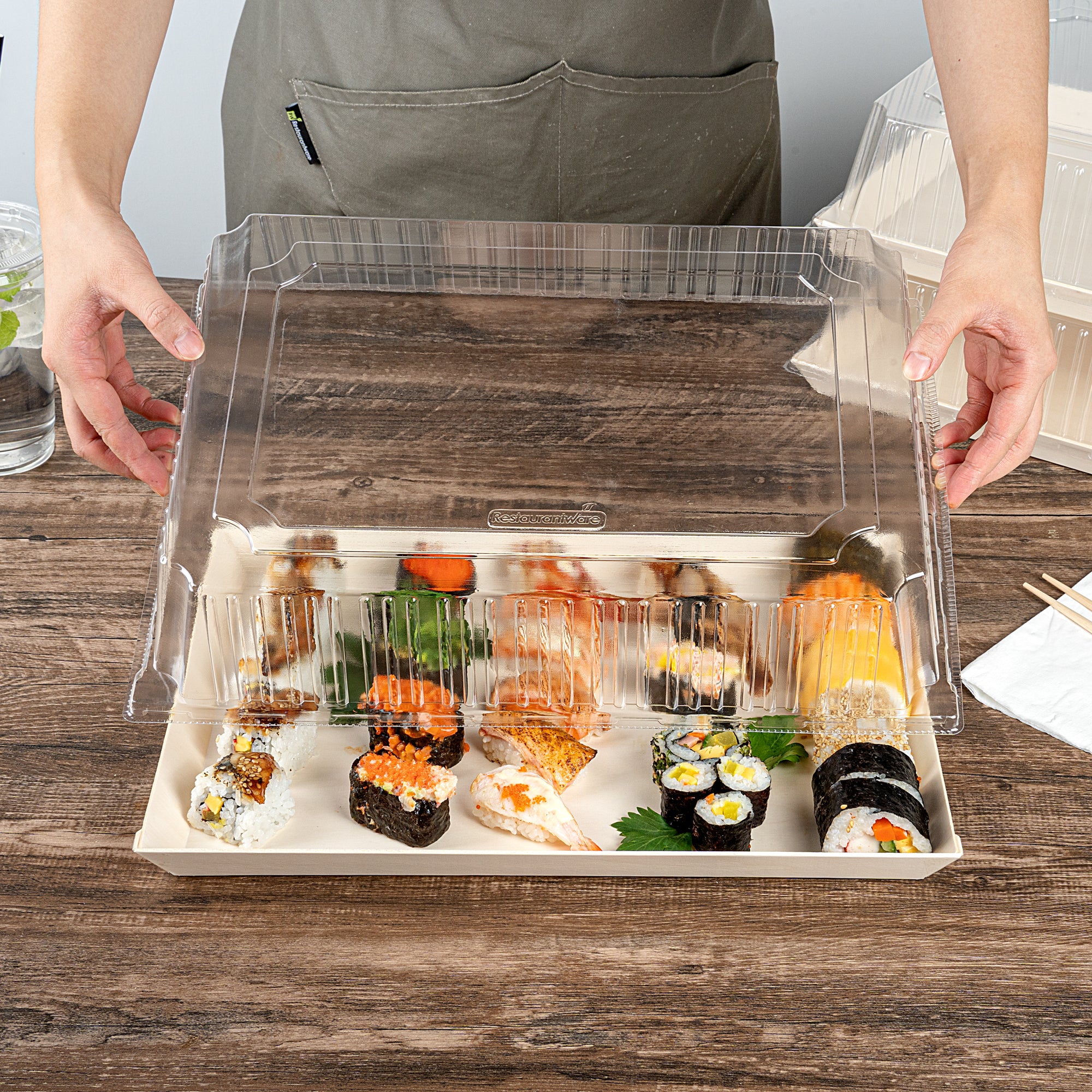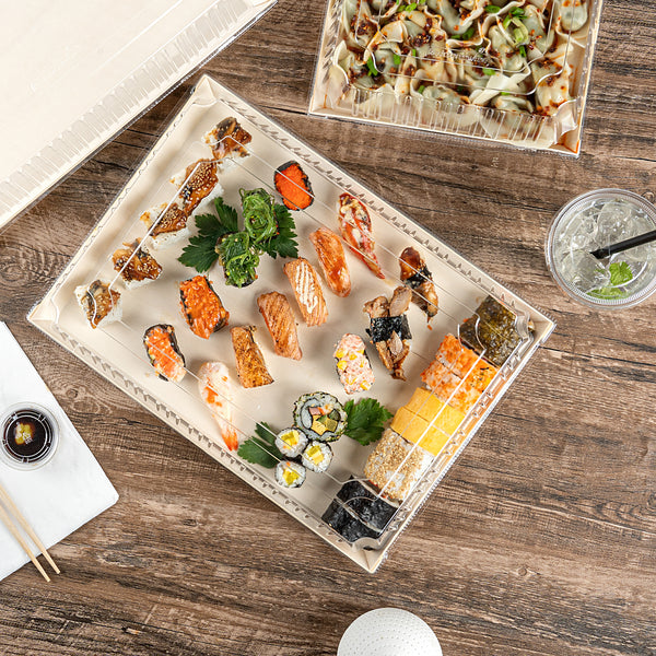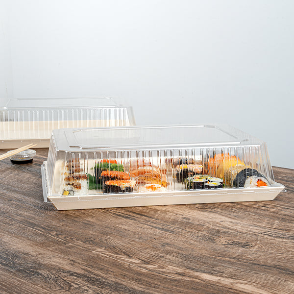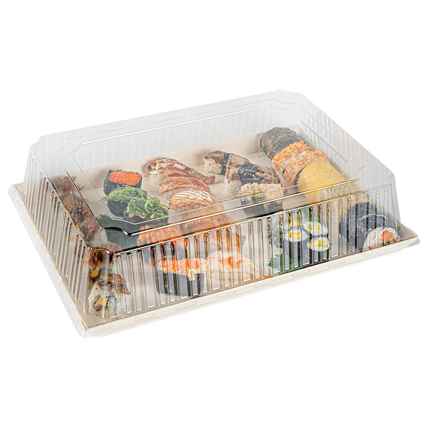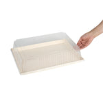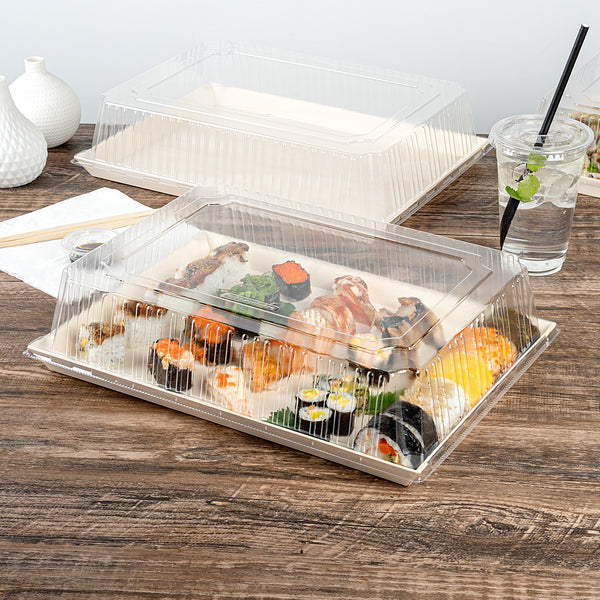 Keep your culinary creations fresher for longer with our Taipei Rectangle Clear Plastic Lids. Constructed with high-quality PET plastic, these clear lids offer superior robustness and durability. When paired with their matching poplar plates (SKU: RWB0597K), these plastic lids become an exceptional solution for takeaway meals. The clear finish of these rectangle lids lets your customers take a sneak peek into their delicious meals, enhancing the overall dining experience. With a raised design, these plate lids ensure there is ample room for any extras or garnishes you have added. Designed to make post-meal cleanup a breeze, these clear plastic lids are disposable and convenient to use. These rectangular plastic lids are 15.25 inches in length by 11.25 inches in width by 2.75 inches in height. Sold in a 100 count box. Plates are available and sold separately.