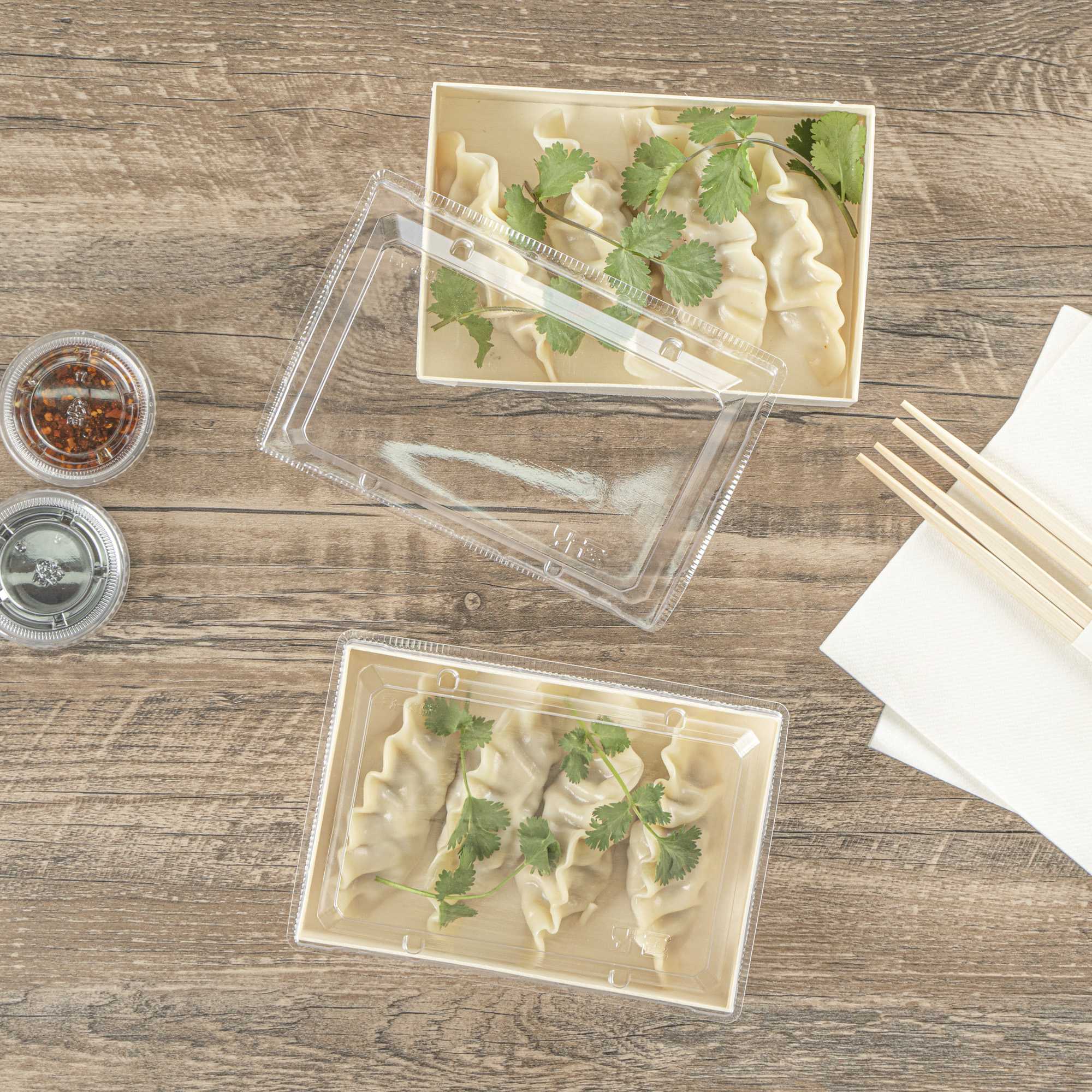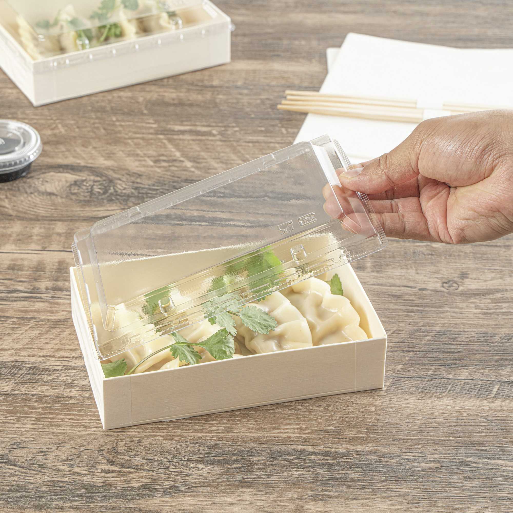 Ensure freshness and elevate food presentation with our Taipei Rectangle Clear Plastic Lids. Designed for a snug fit, these lids securely seal our 25-ounce poplar bento boxes (SKU: RWB0788K-10), perfect for take out, delivery, and grab-and-go service. Made from sturdy plastic, the clear and transparent dome design provides excellent visibility of your culinary creations, enhancing visual appeal while preserving freshness. Compact and efficient, these lids allow for neat stacking, maximizing storage space in busy kitchens and streamlining service. Each lid measures 6.89 inches in length by 4.53 inches in width. Sold in a 10 count box.