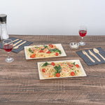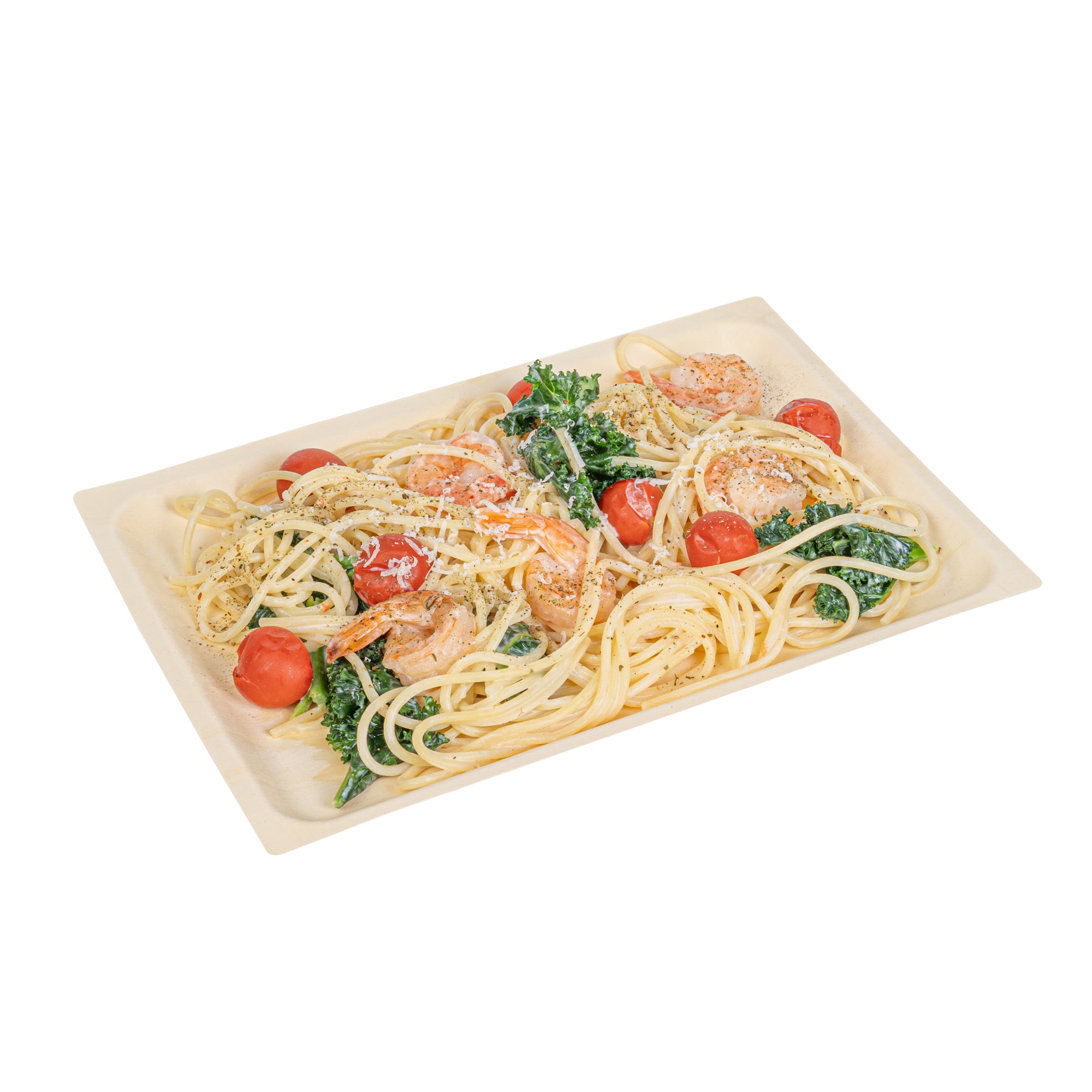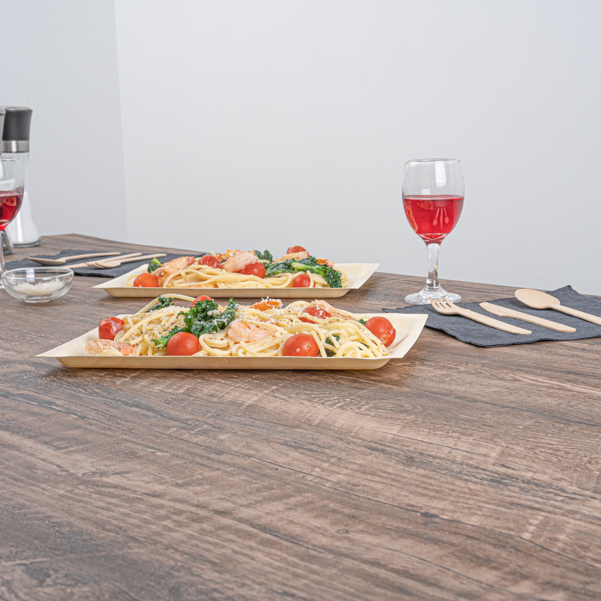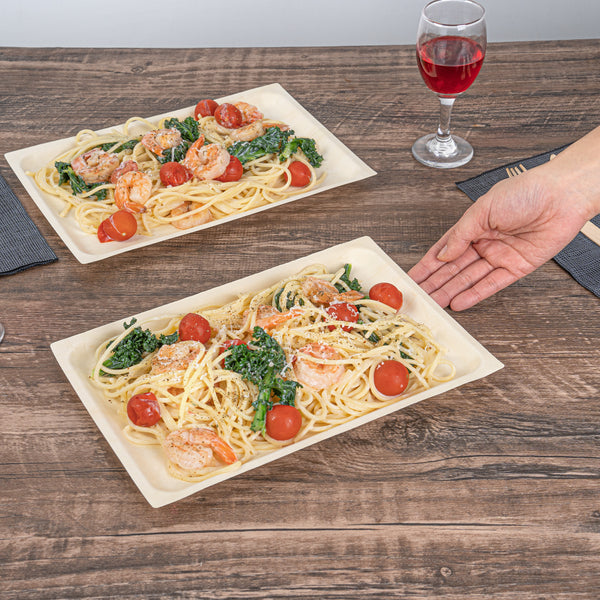 Serve salads with our Taipei Rectangle Natural Poplar Plates. Crafted from poplar wood, these disposable plates are durable and suitable for serving hot and cold food at your next catered event. These serving plates are designed to be greaseproof for saucy dishes, ensuring a mess-free dining experience. To reduce your carbon footprint, these party plates are biodegradable and commercially compostable, offering an eco-friendly serving option. These food plates feature a rectangular design that adds a modern and sophisticated touch to your presentation, enhancing the overall aesthetic appeal of your culinary creations. Featuring a neutral finish, these serving dishes create an inviting and timeless ambiance for your dining experience. These pasta plates measure 10.75 inches in length by 7.25 inches in width. Sold in a 50 count box. These items will only degrade outside of the traditional solid waste stream.