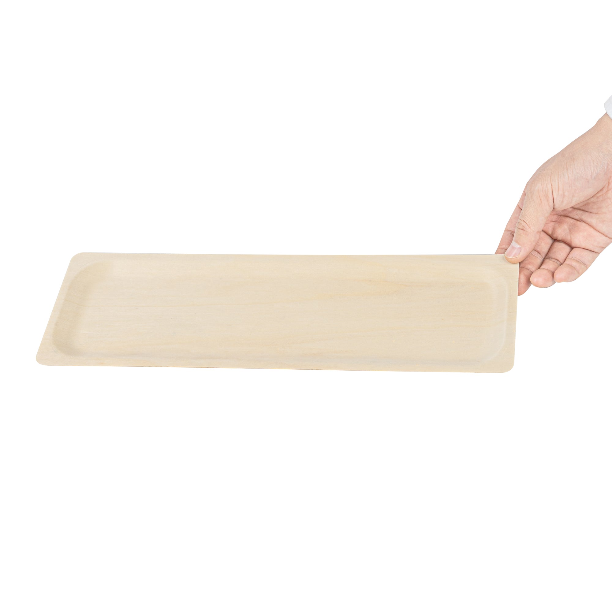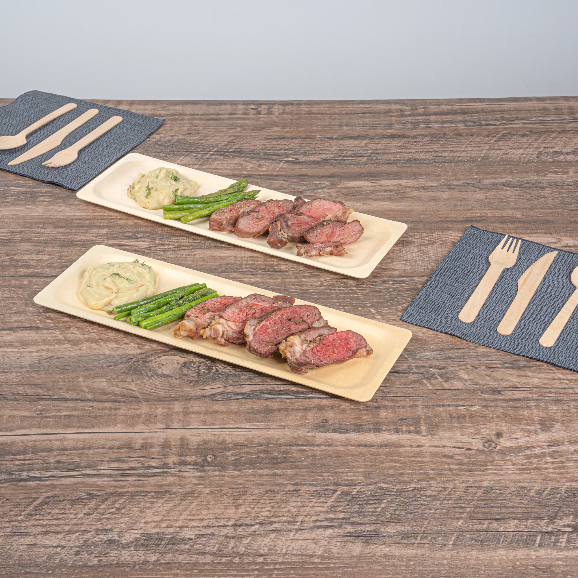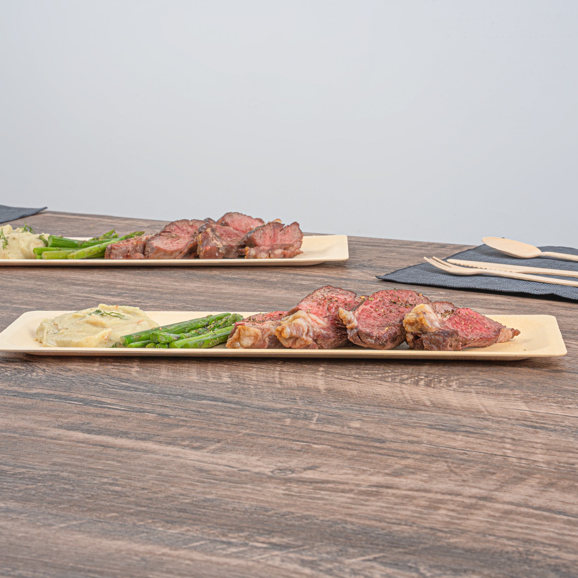 Upgrade your dining experience with our Taipei Rectangle Natural Poplar Plates. These serving plates are created from poplar wood and are durable enough to accommodate hot and cold dishes. With a greaseproof construction, these party plates are an ideal companion for saucy dishes while maintaining their integrity throughout use. These disposable plates are biodegradable and commercially compostable, allowing you to reduce waste and promote sustainability. With their sleek rectangular shape, these food plates effortlessly blend contemporary style with versatile functionality. These serving dishes feature a neutral finish, providing a subtle yet sophisticated aesthetic that seamlessly complements diverse table settings. Measuring 14.25 inches in length by 4.75 inches in width, these rectangle plates provide ample space for generously portioned meals or shared appetizers. Sold in a 50 count box. These items will only degrade outside of the traditional solid waste stream.
