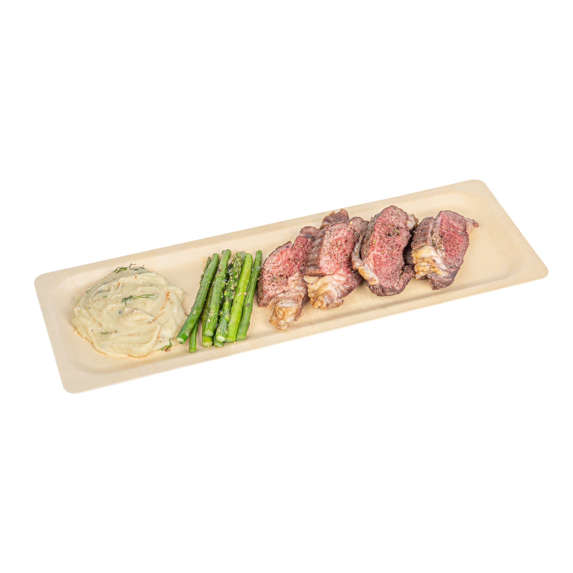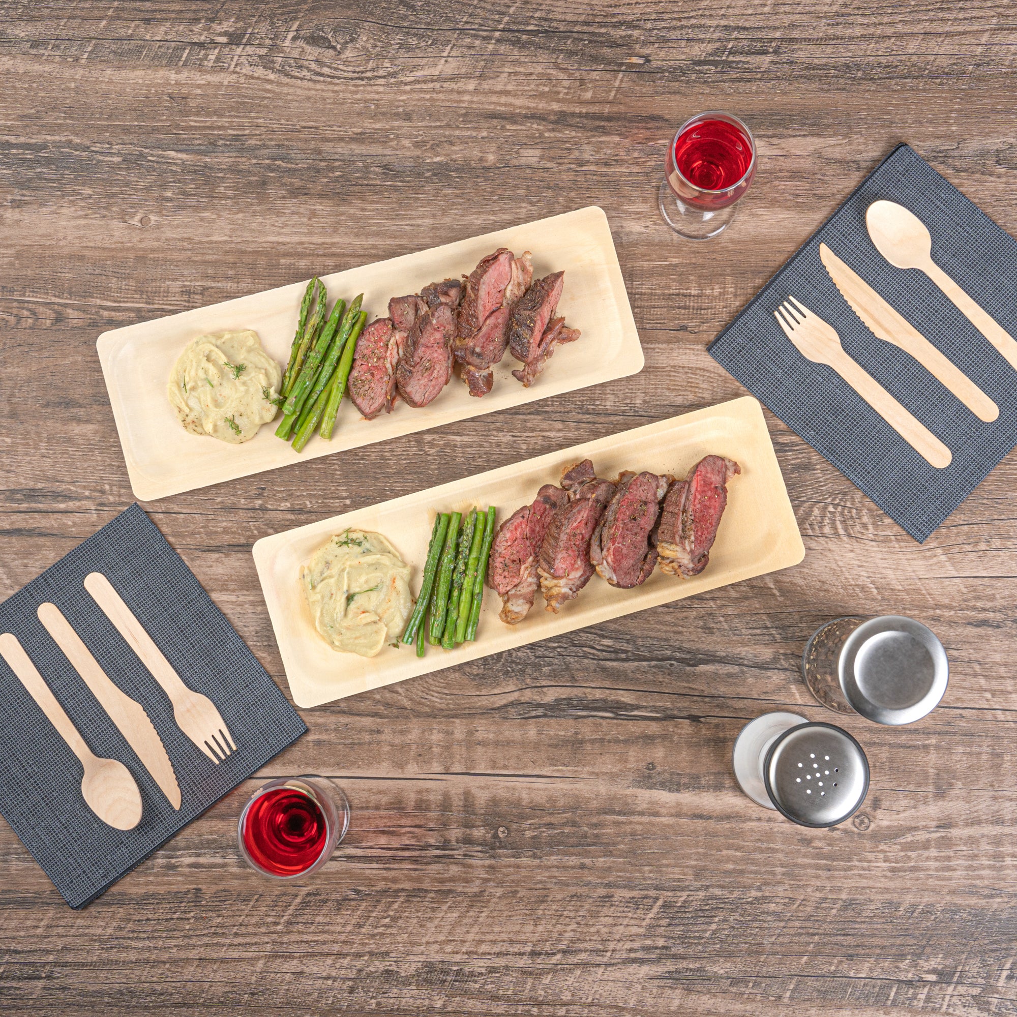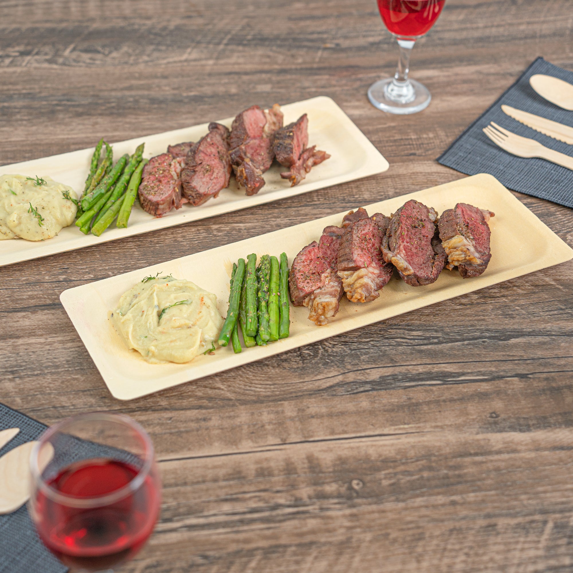 Upgrade your dining experience with our Taipei Rectangle Natural Poplar Plates. These serving plates are created from poplar wood and are durable enough to accommodate hot and cold dishes. With a greaseproof construction, these party plates are an ideal companion for saucy dishes while maintaining their integrity throughout use. These disposable plates are biodegradable and commercially compostable, allowing you to reduce waste and promote sustainability. With their sleek rectangular shape, these food plates effortlessly blend contemporary style with versatile functionality. These serving dishes feature a neutral finish, providing a subtle yet sophisticated aesthetic that seamlessly complements diverse table settings. Measuring 14.25 inches in length by 4.75 inches in width, these rectangle plates provide ample space for generously portioned meals or shared appetizers. Sold in a 50 count box. These items will only degrade outside of the traditional solid waste stream.