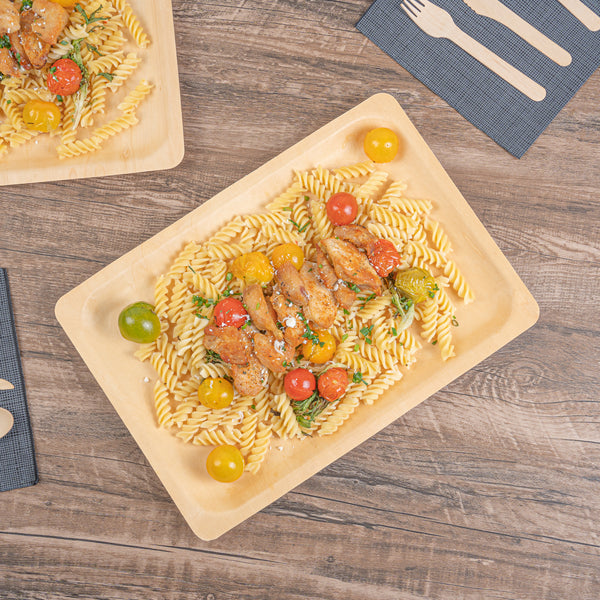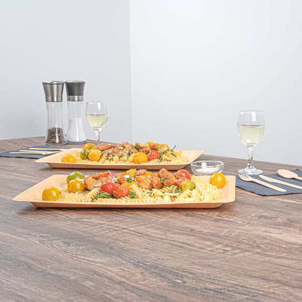 Create a colorful fruit display with our Taipei Rectangle Natural Poplar Plates. Robustly crafted from poplar wood, these party plates are ideal for serving a variety of hot and cold dishes, offering versatility for your culinary presentations. These serving plates are greaseproof to easily serve a variety of dishes without concerns of leakage or seepage. Ideal for eco-conscious businesses, these disposable plates are biodegradable and commercially compostable. Designed with a rectangular silhouette, these food plates enhance your presentation with a modern look. These serving dishes have a neutral finish that adds a touch of timeless elegance to your tablescapes and infuses a warm, inviting atmosphere into your dining experience. Measuring 14.17 inches in length by 9.84 inches in width, these disposable appetizer plates are ideal for serving generous main courses or elaborate spreads. Sold in a 200 count box. These items will only degrade outside of the traditional solid waste stream.