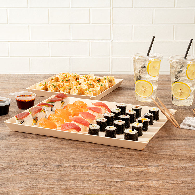 Showcase your culinary creations using our Taipei Rectangle Poplar Plates. Constructed from eco-friendly poplar wood, these rectangle poplar plates are resilient and sturdy, designed to flawlessly serve a plethora of meals without succumbing to cracks or chips. Coated with a glassine paper film lining, each biodegradable poplar plate offers a grease-resistant feature that is adaptable for both hot and cold fares. These disposable plates are single-use products designed specifically to alleviate the burdens of post-meal dishwashing and cleanup. With dimensions of 15.25 inches in length by 10.75 inches in width by 1 inch in height, these commercially compostable dinner plates provide ample space to plate an assortment of food, from bite-sized appetizers to generous main courses. Shipped in a 100 count box. This item will only degrade outside of the traditional solid waste stream.