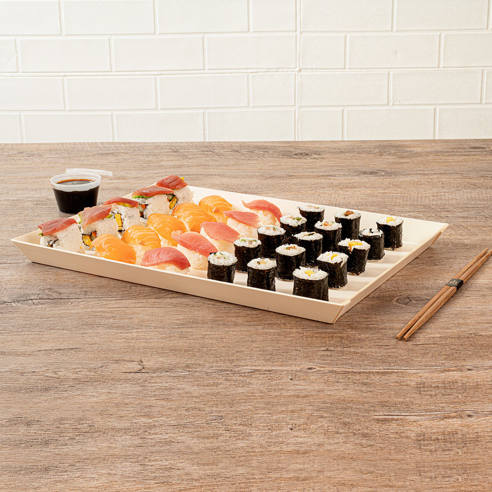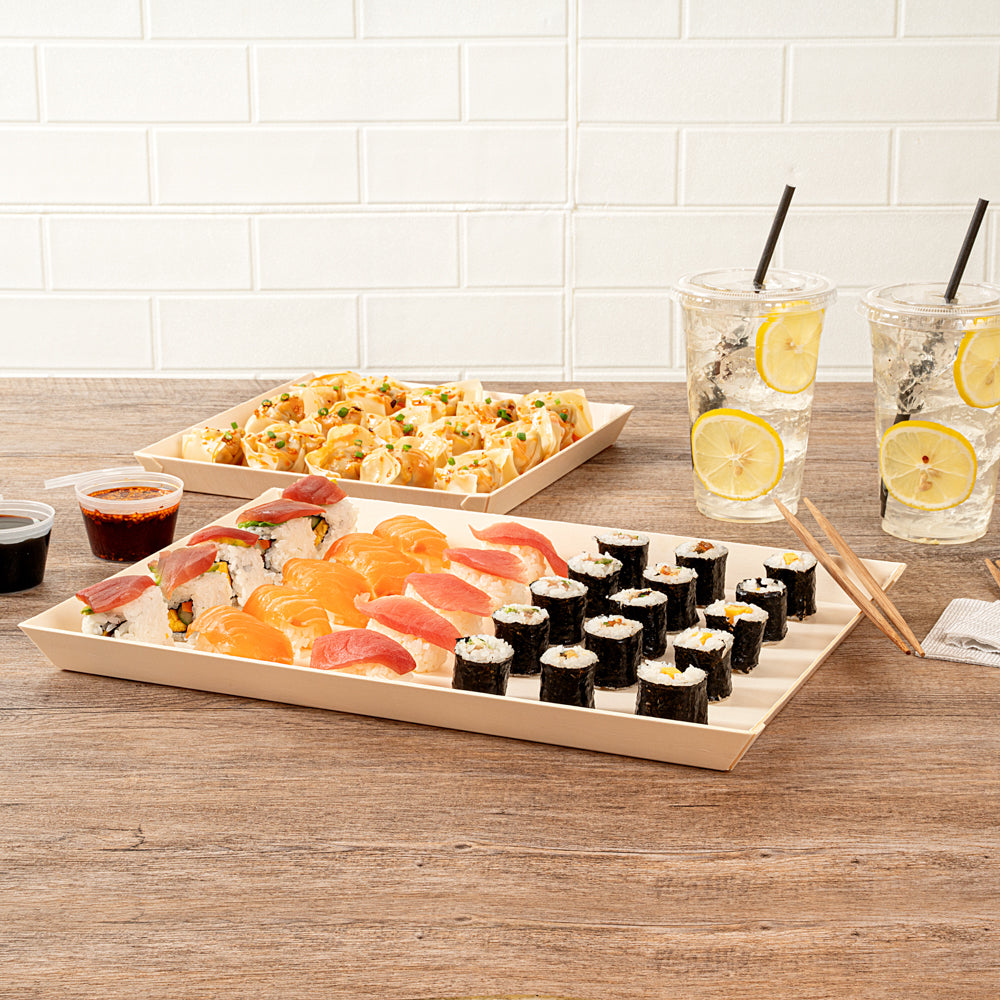 Enhance your food presentation with eco-friendly elegance. The Taipei Grease-Resistant Rectangular Wood Plate features a 15.16 inches long poplar wood construction that is both commercially compostable and biodegradable, supporting your green initiatives by reducing environmental impact while serving as a biodegradable disposable plate. Its grease-resistant lining prevents oils or sauces from seeping through, ensuring a pristine and appetizing presentation every time. The natural finish of this rectangular wood plate adds a rustic charm to your dishes, making it ideal for catering events or outdoor festivals where style meets sustainability. With its disposable design, post-meal cleanup becomes a breeze, saving you valuable time and labor costs. Elevate your offerings with this versatile wooden serving tray that withstands various food types without cracking. Each order includes 25 Taipei Grease-Resistant Rectangular Wood Plate.