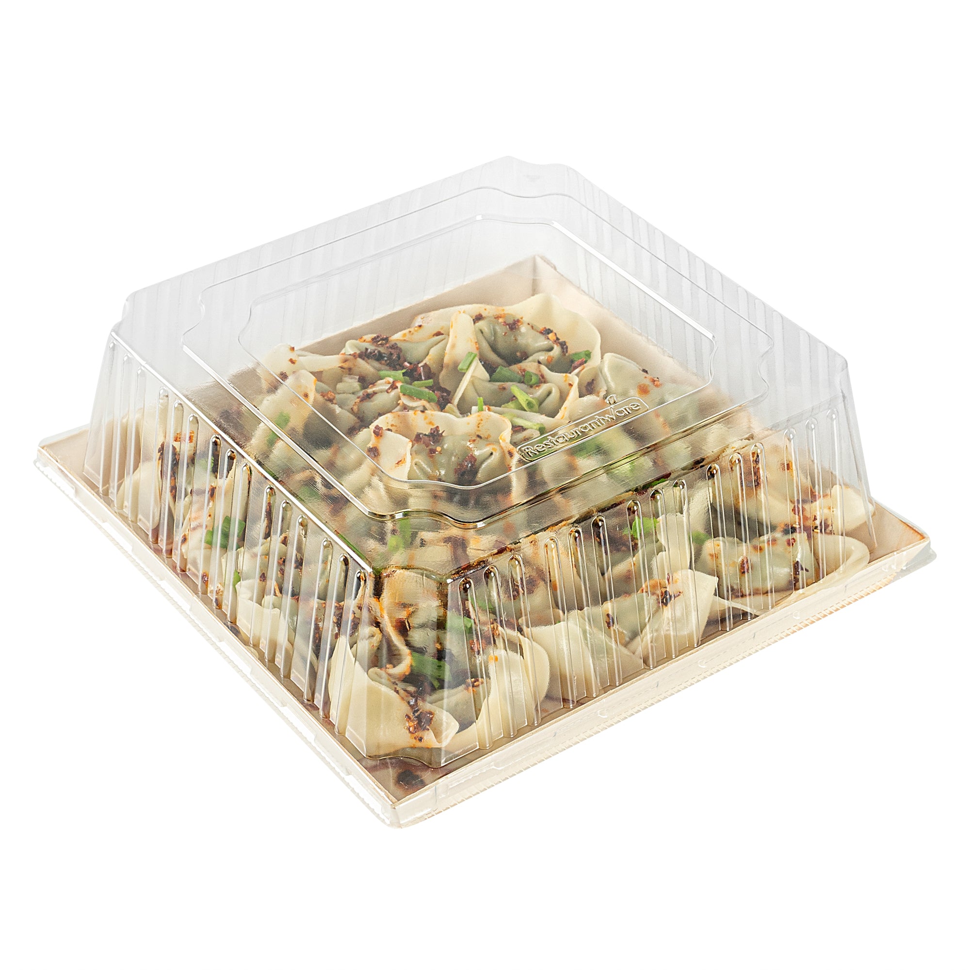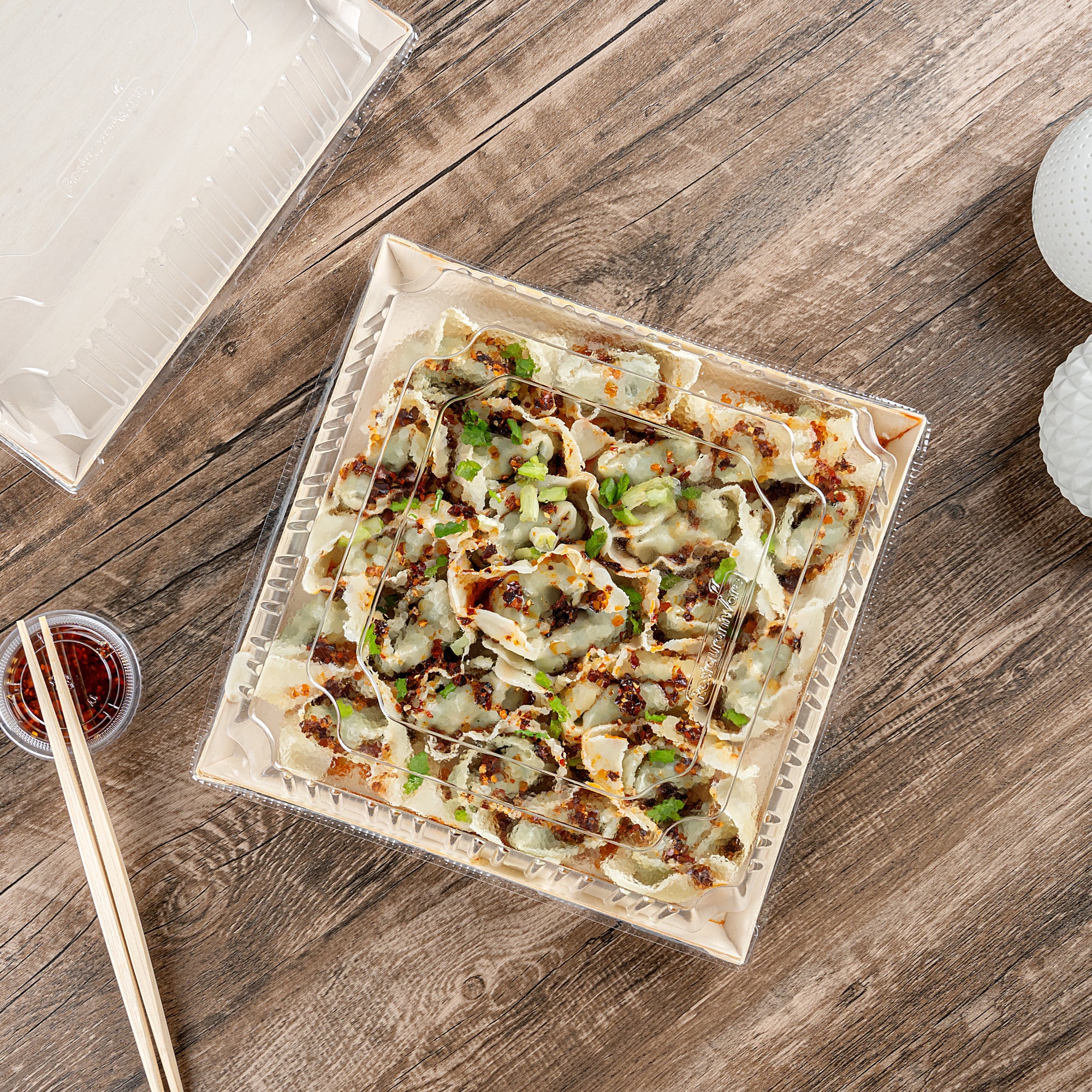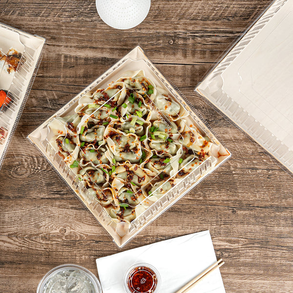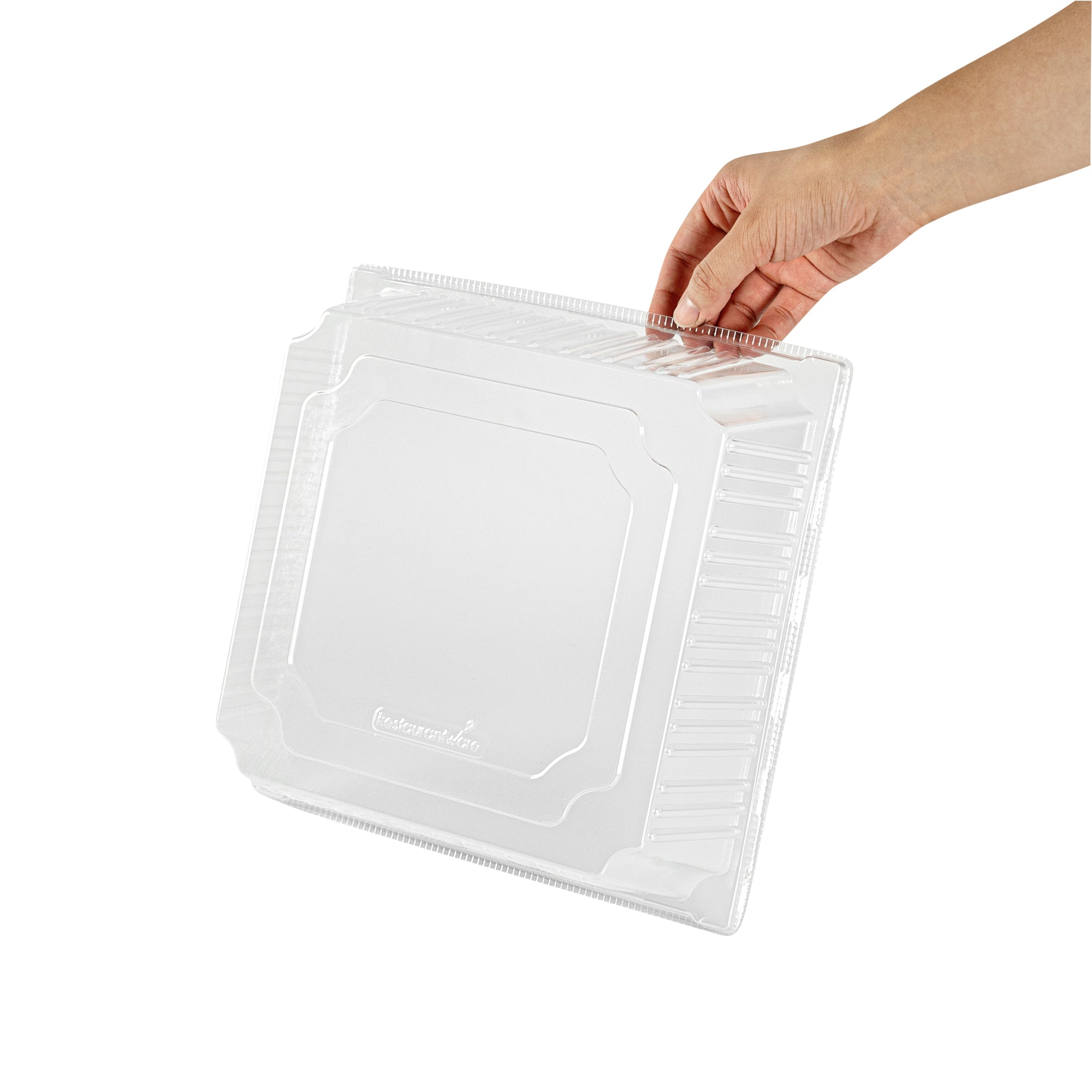 Seal the freshness of your meal with our Taipei Square Clear Plastic Lids. These clear lids are made from PET plastic for premium durability. Pair these plastic lids with its compatible poplar plates (SKU: RWB0596K-25) for a convenient take out solution. The crystal-clear finish of these square lids offers a glimpse of the delectable contents and adds a touch of elegance to your culinary masterpieces. These plate lids have an elevated roof to provide ample space for toppings or servings to your gourmet creations. Disposable, these clear plastic lids simplify your post-meal cleanup. These square plastic lids measure 9.5 inches long by 9.5 inches wide by 2.75 inches tall. Sold in a 25 count box. Plates are available and sold separately.